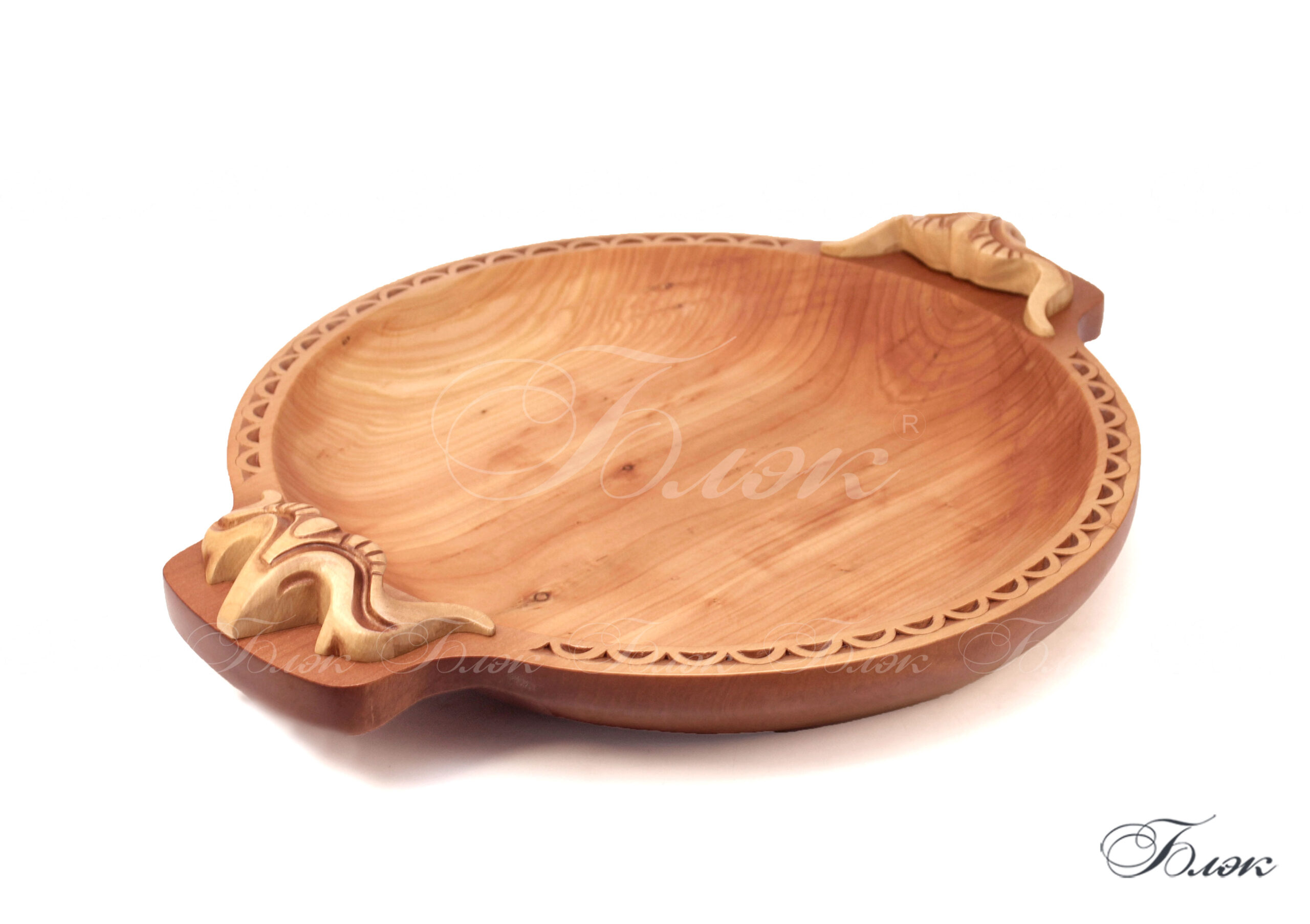 | Покрытие изделия | Блюдо с внешней стороны тонировано и покрыто четырёхслойным защитным лаком, подчёркивающим резные элементы изделия. Внутренняя часть обработана горячим растительным маслом. |
