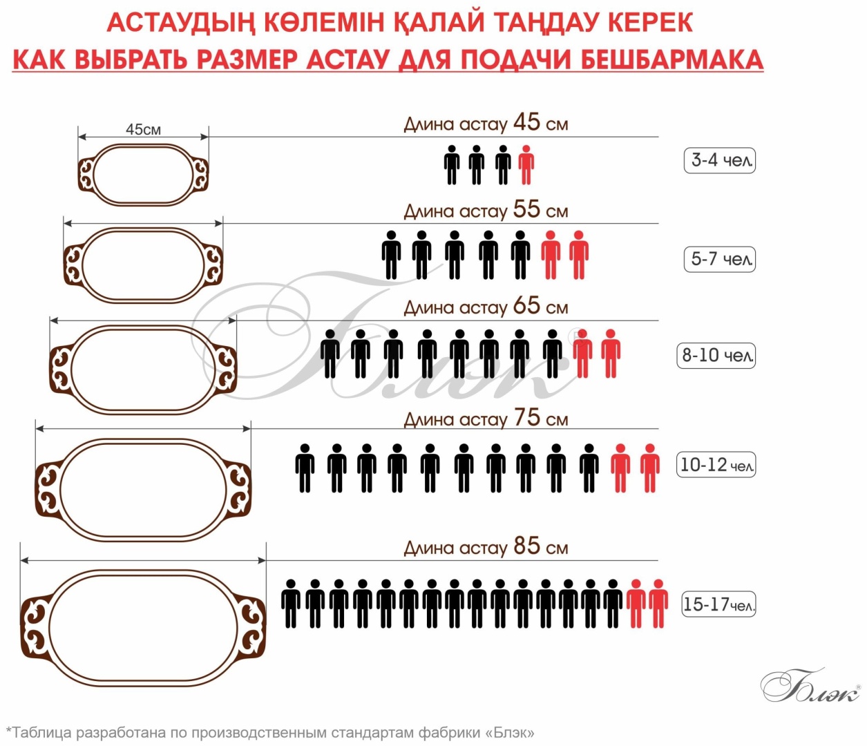 | Объем | 45см – малый размер для подачи головы барана, мантов, плова и др. 55см – малый размер для подачи куырдака, жамбаса, курицы, утки и др. |