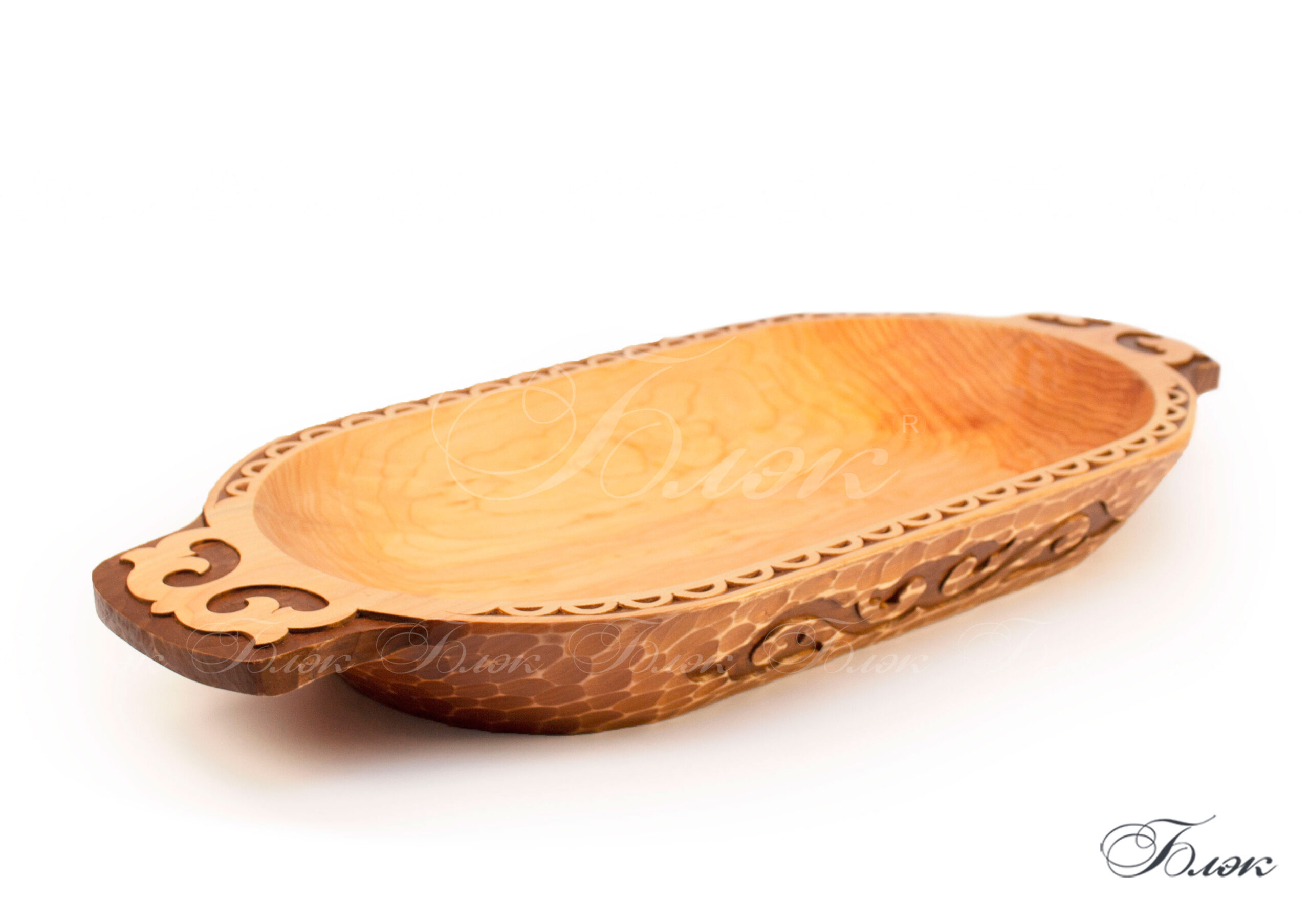 | Покрытие изделия | Блюдо с внешней стороны тонировано и покрыто четырёхслойным защитным лаком, подчёркивающим орнамент и резные элементы изделия. Внутренняя часть обработана растительным маслом. |