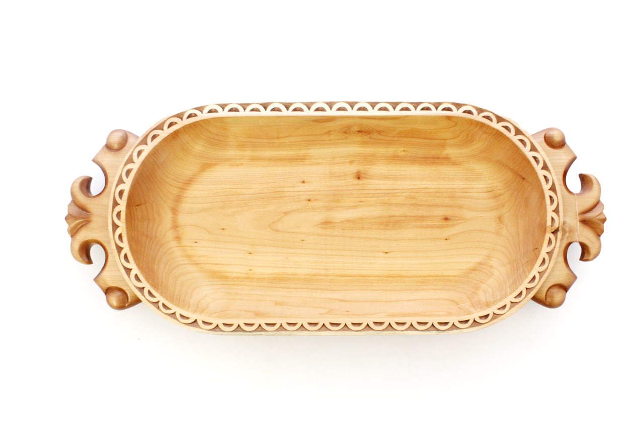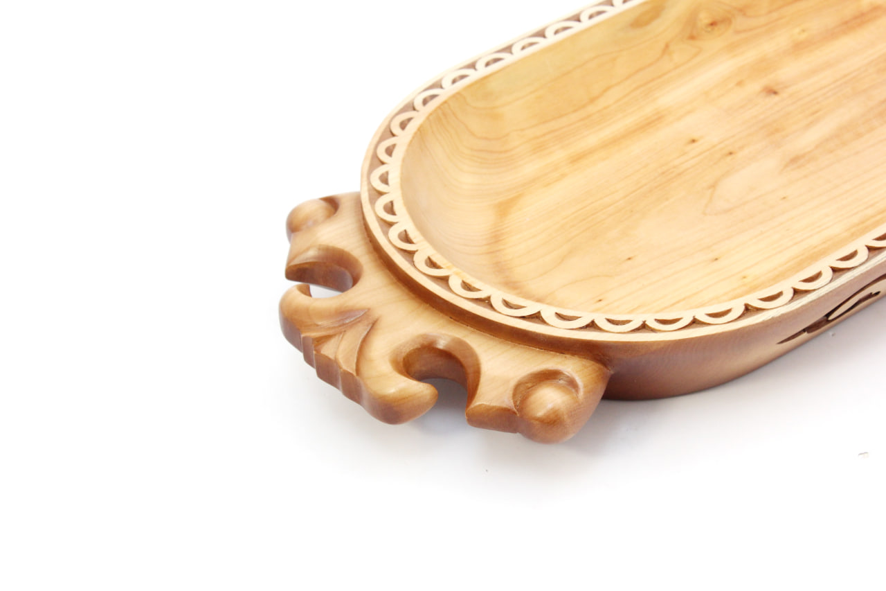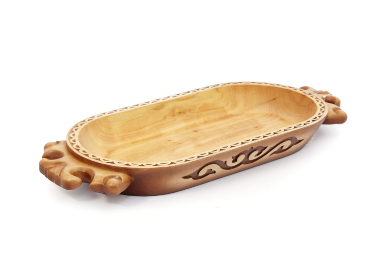 | Форма, размер и материал | Блюдо классической овальной формы. Размер вместе с ручками 45, 55, 65, 75, 85 см. Средняя глубина 5,5 см. Размер более 85 см. изготавливается на заказ. Используемый материал- береза. |