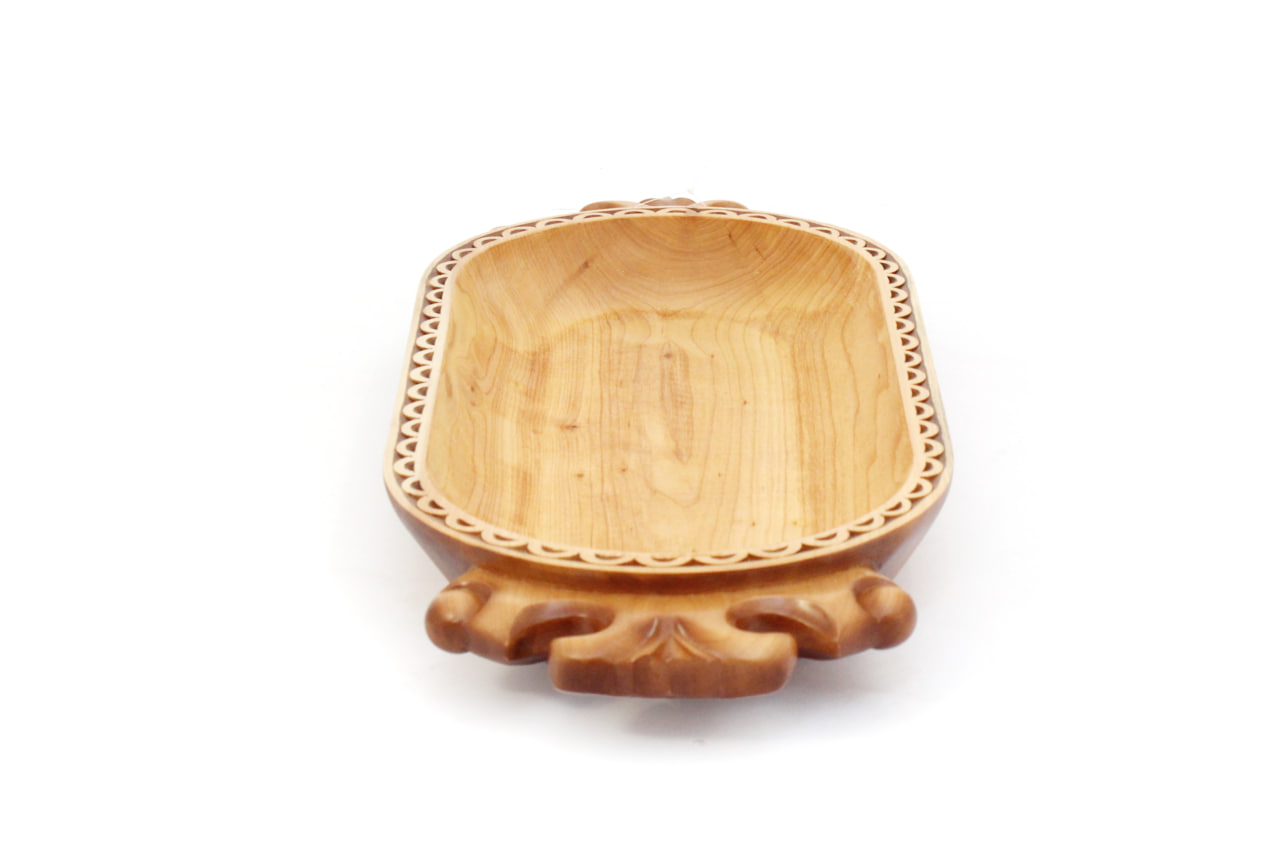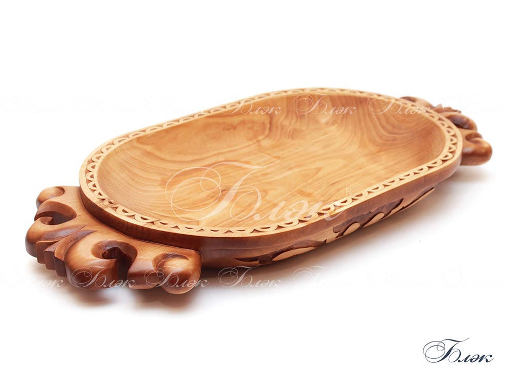 | Покрытие изделия | Блюдо с внешней стороны тонировано и покрыто четырёхслойным защитным лаком, подчёркивающим орнамент и резные элементы изделия. Внутренняя часть обработана растительным маслом. |