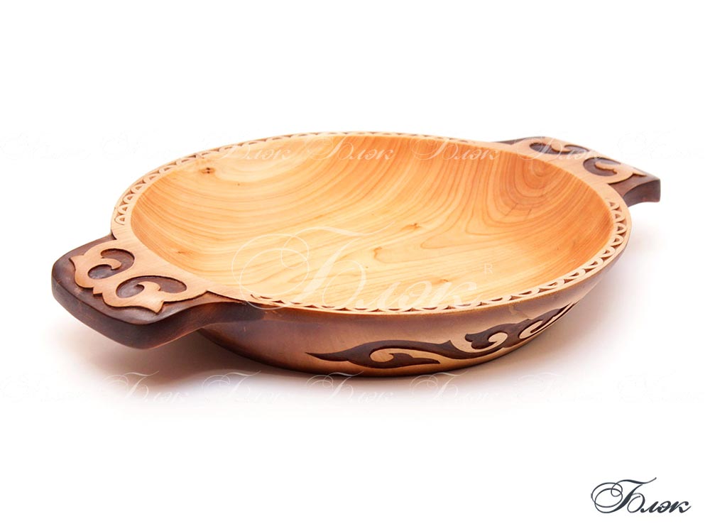 | Покрытие изделия | Блюдо с внешней стороны тонировано и покрыто четырёхслойным защитным лаком, подчёркивающим орнамент и резные элементы изделия. Внутренняя часть обработана растительным маслом. |