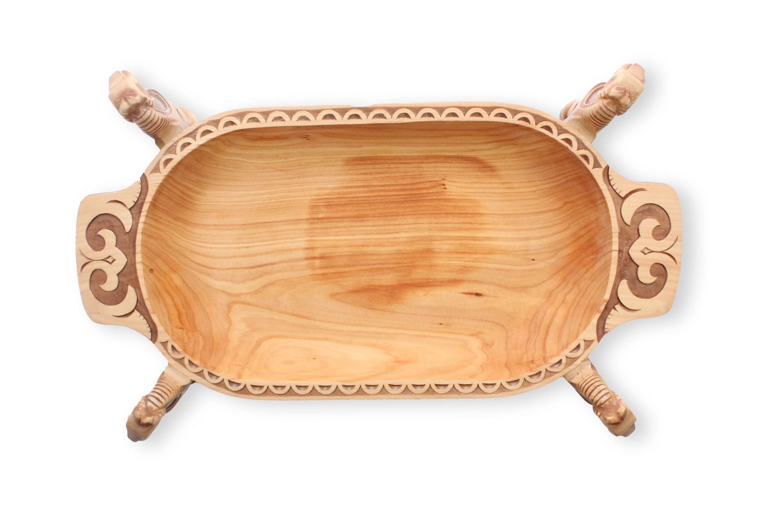 | Покрытие изделия | Блюдо с внешней стороны тонировано и покрыто четырёхслойным защитным лаком, подчёркивающим орнамент и резные элементы изделия. Внутренняя часть обработана растительным маслом. |
