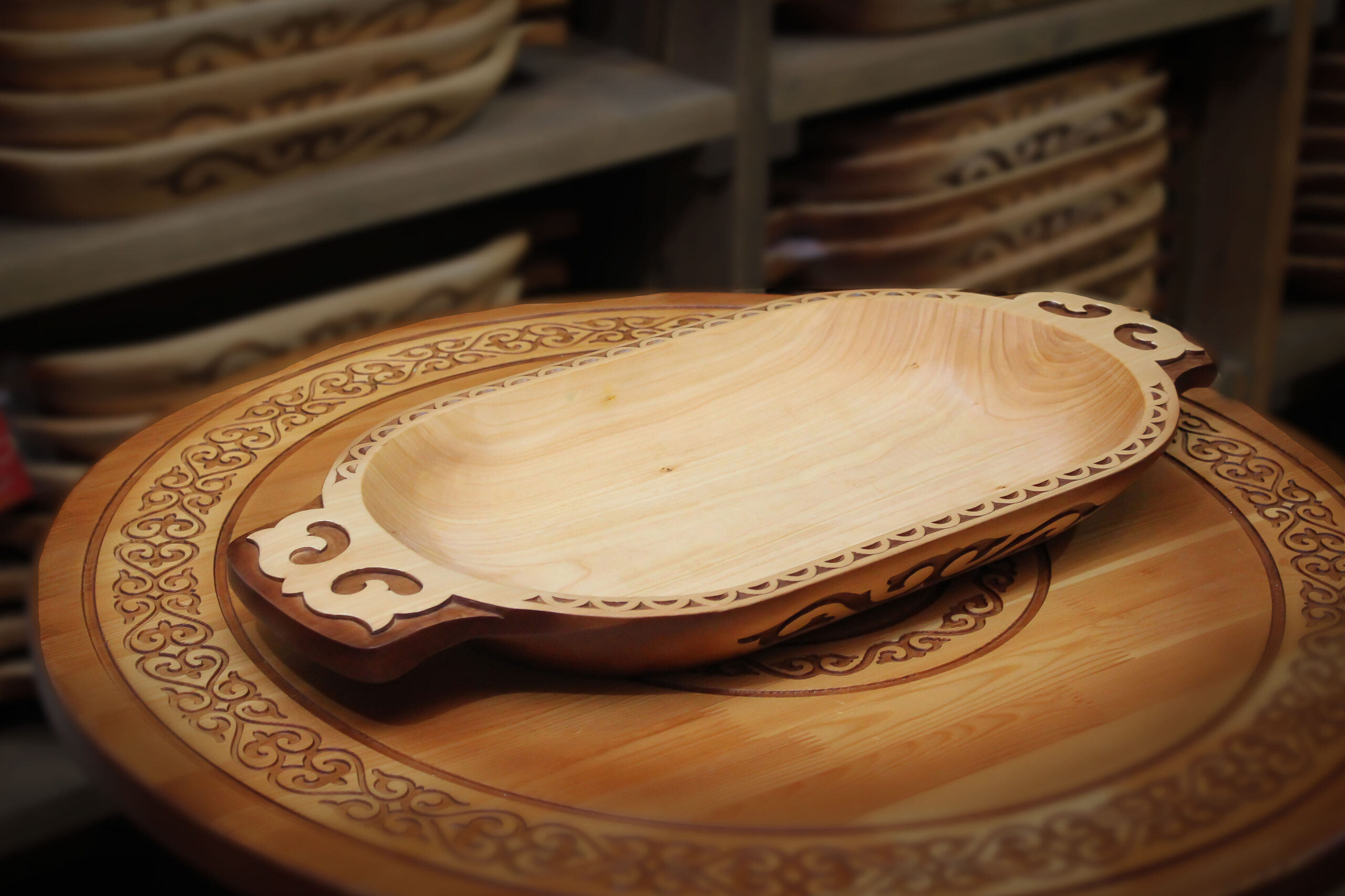 | Внешние характеристики, описание. | Овальное блюдо с удобными для переноса ручками. На ручках и боковой части астау вырезан мастерами традиционный казахский орнамент. На бортах вдоль всего блюда нанесена мелкая резьба в виде полукруга. На дне астау выполнена гравировка в виде стилизованного казахского орнамента. Она украшена выразительным орнаментом, что подчёркивает и усиливает декоративную ценность изделия. Подставка под астау выполнена из высококачественной фанеры и обеспечивает устойчивость блюда на столе. Астау изготавливается вручную из цельного куска дерева ивы. |