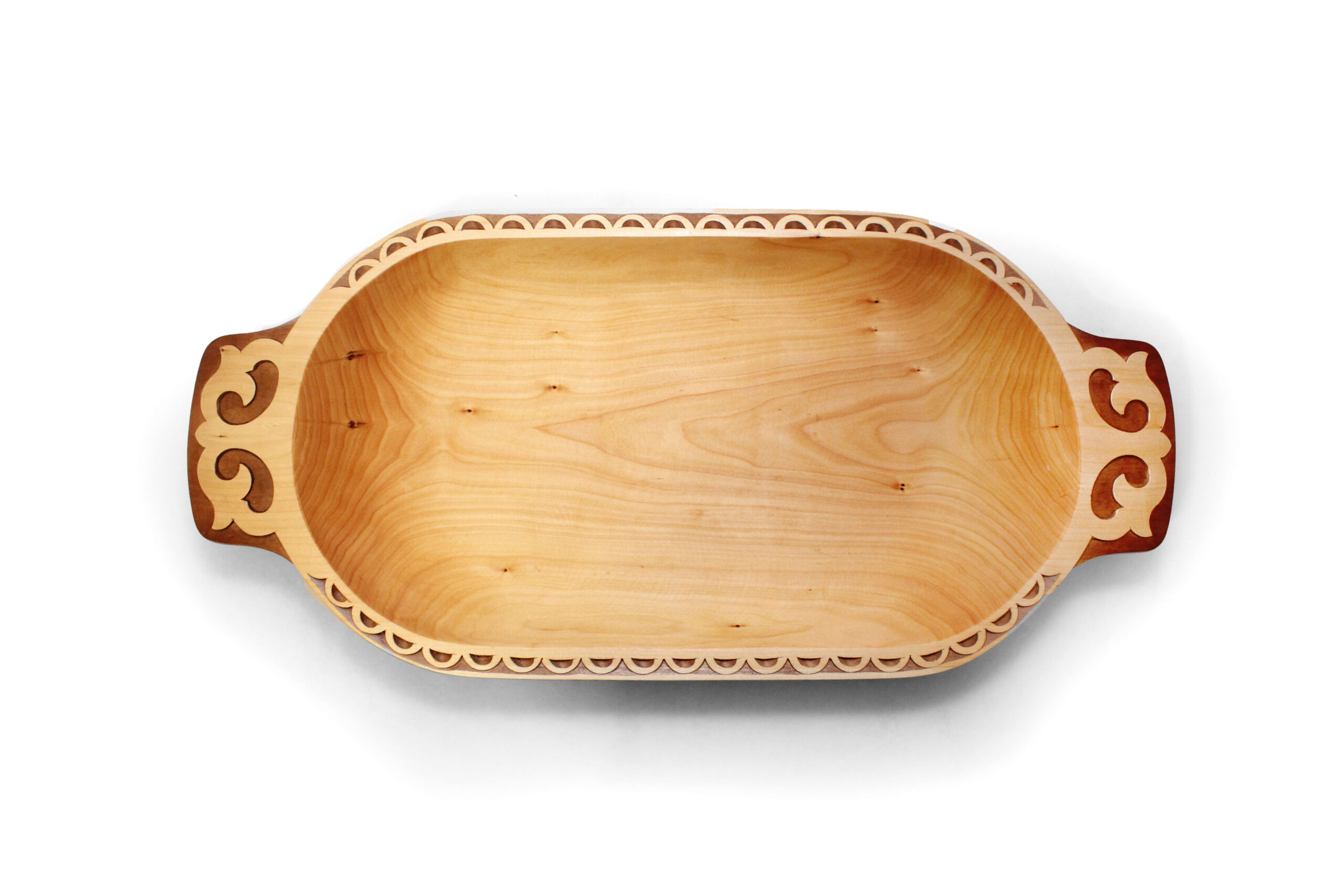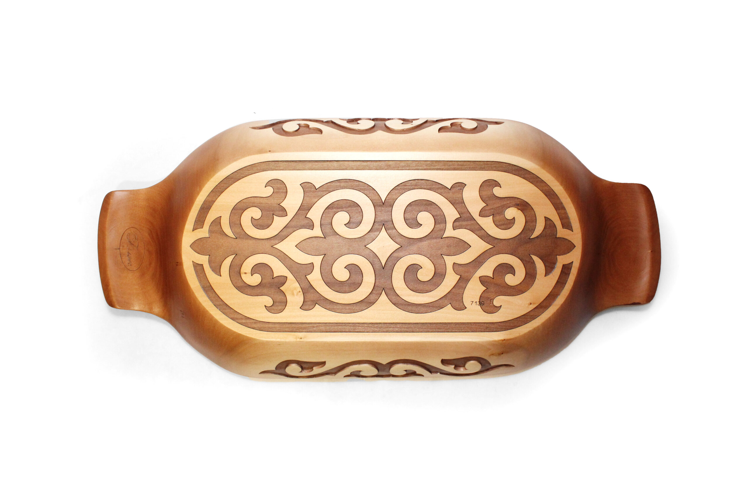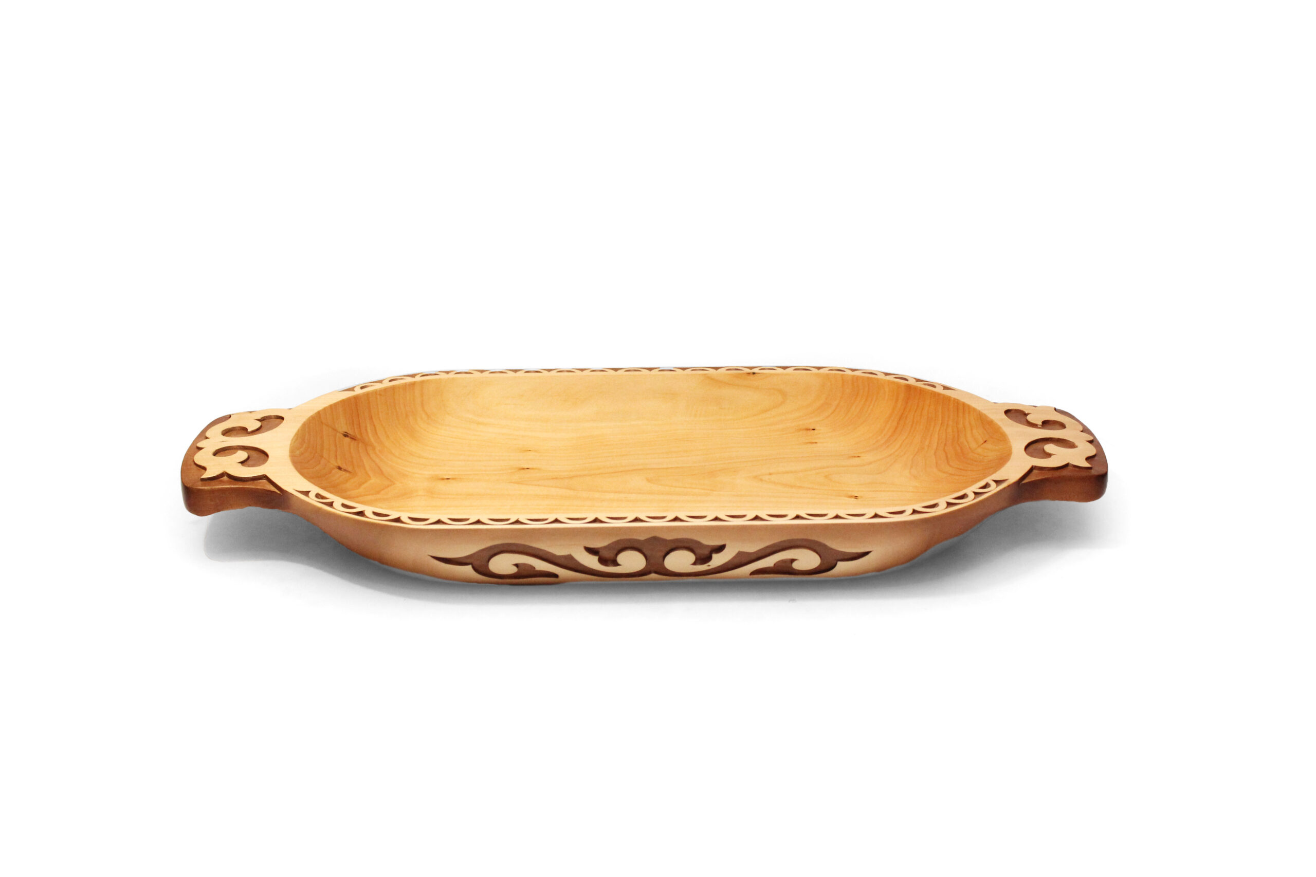 | Покрытие изделия | Блюдо с внешней стороны тонировано и покрыто четырёхслойным защитным лаком, подчеркивающим орнамент и резные элементы изделия. Внутренняя часть обработана растительным маслом. |