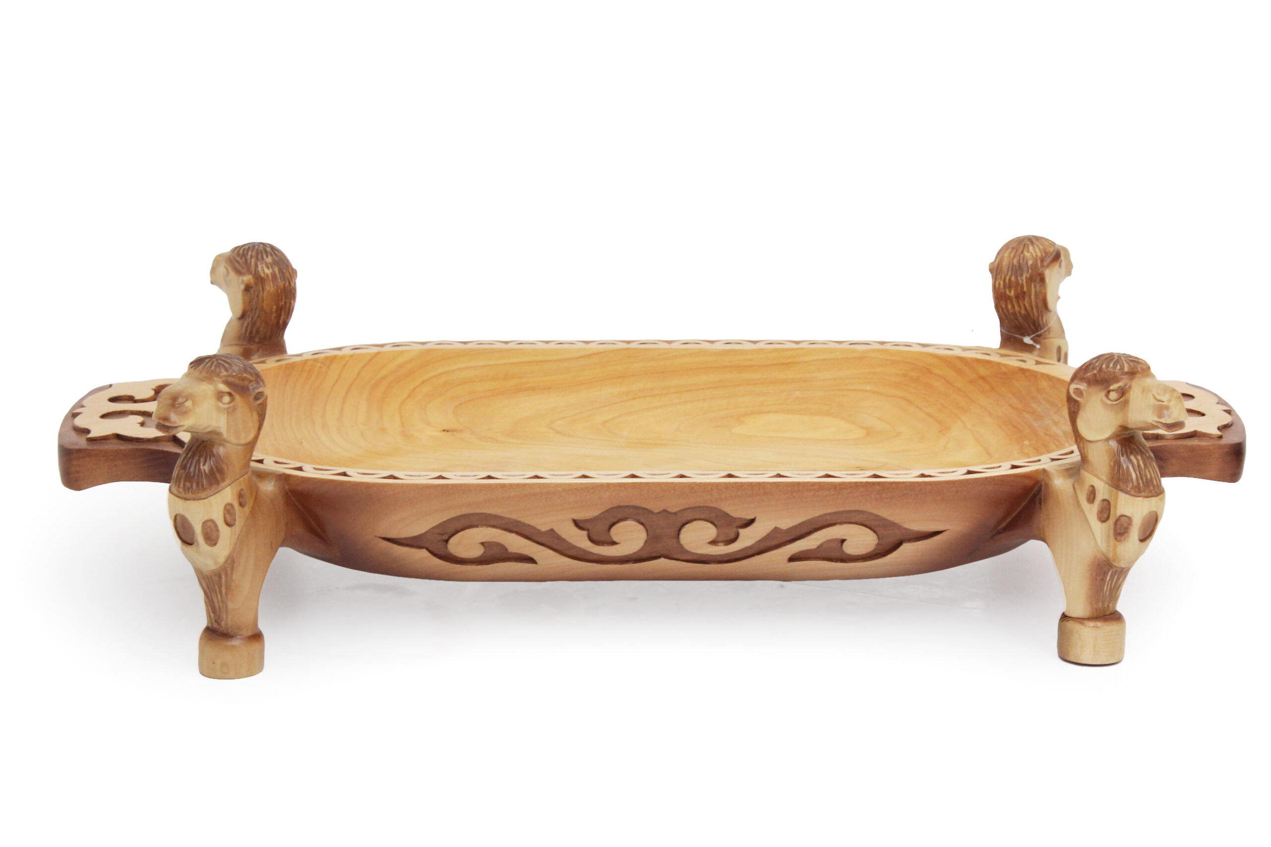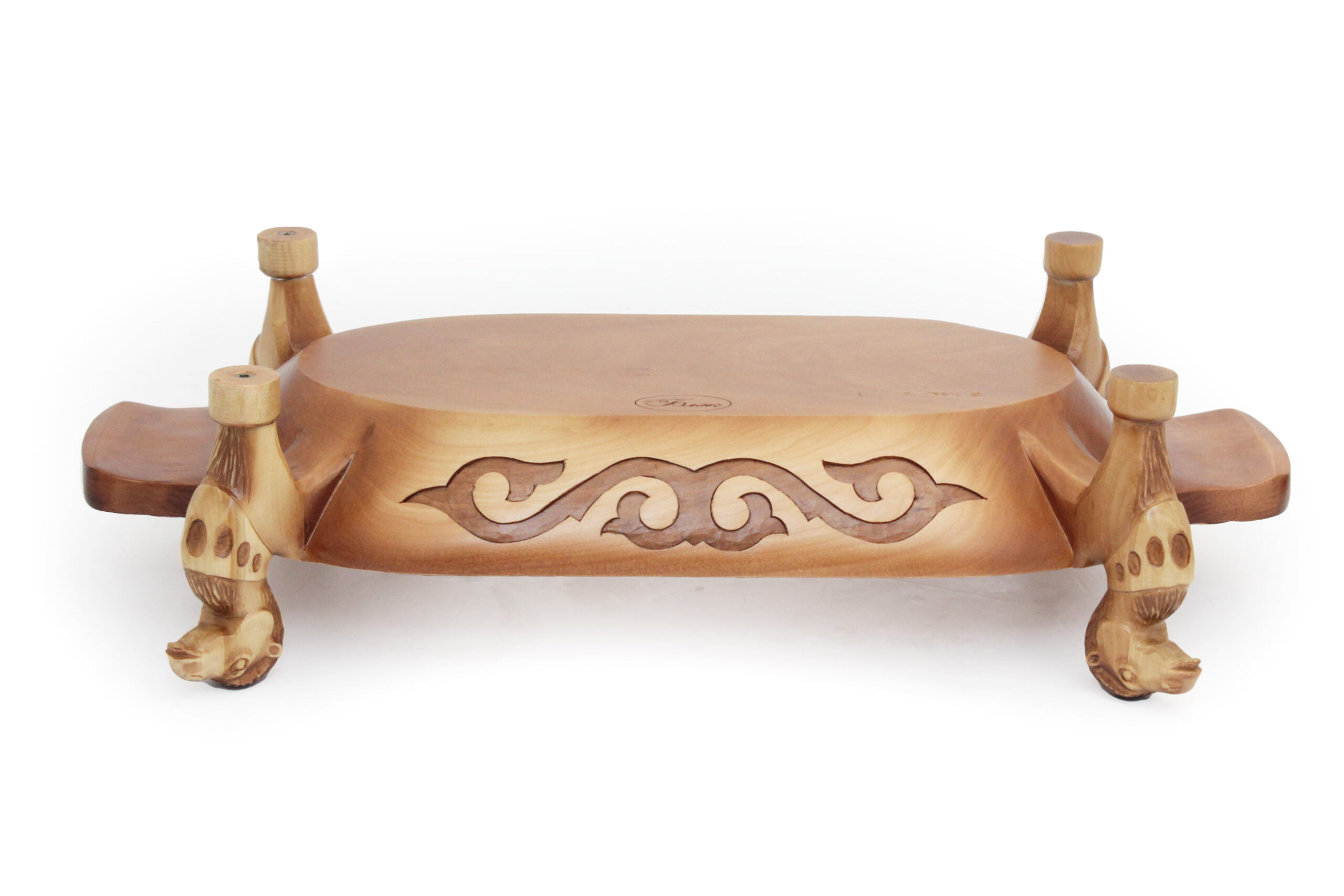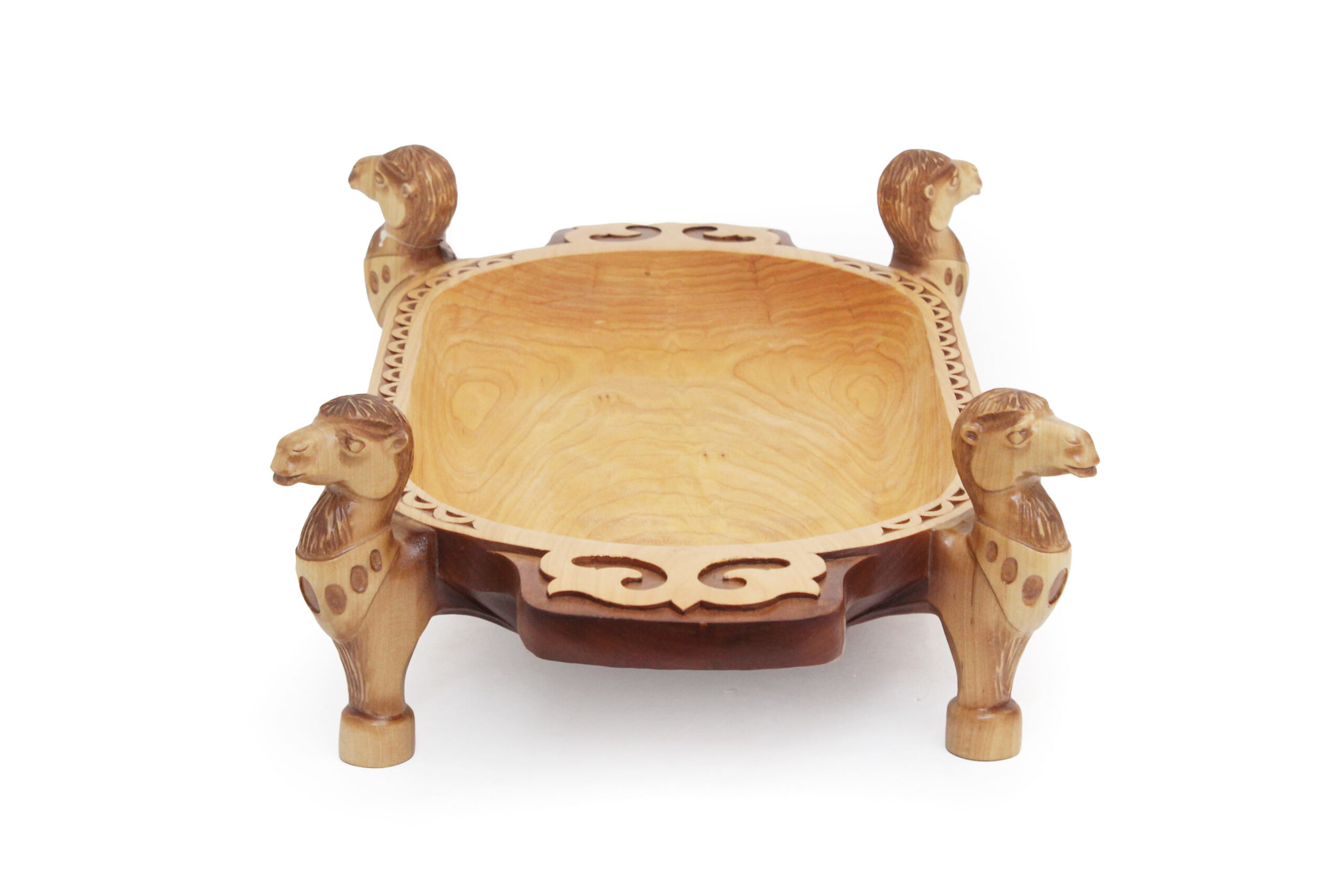 Астау стоит на 4-х ножках в виде стилизованных животных — верблюдов. Ножки добавляют блюду оригинальность и престиж. Астау изготавливается вручную из цельной доски. |