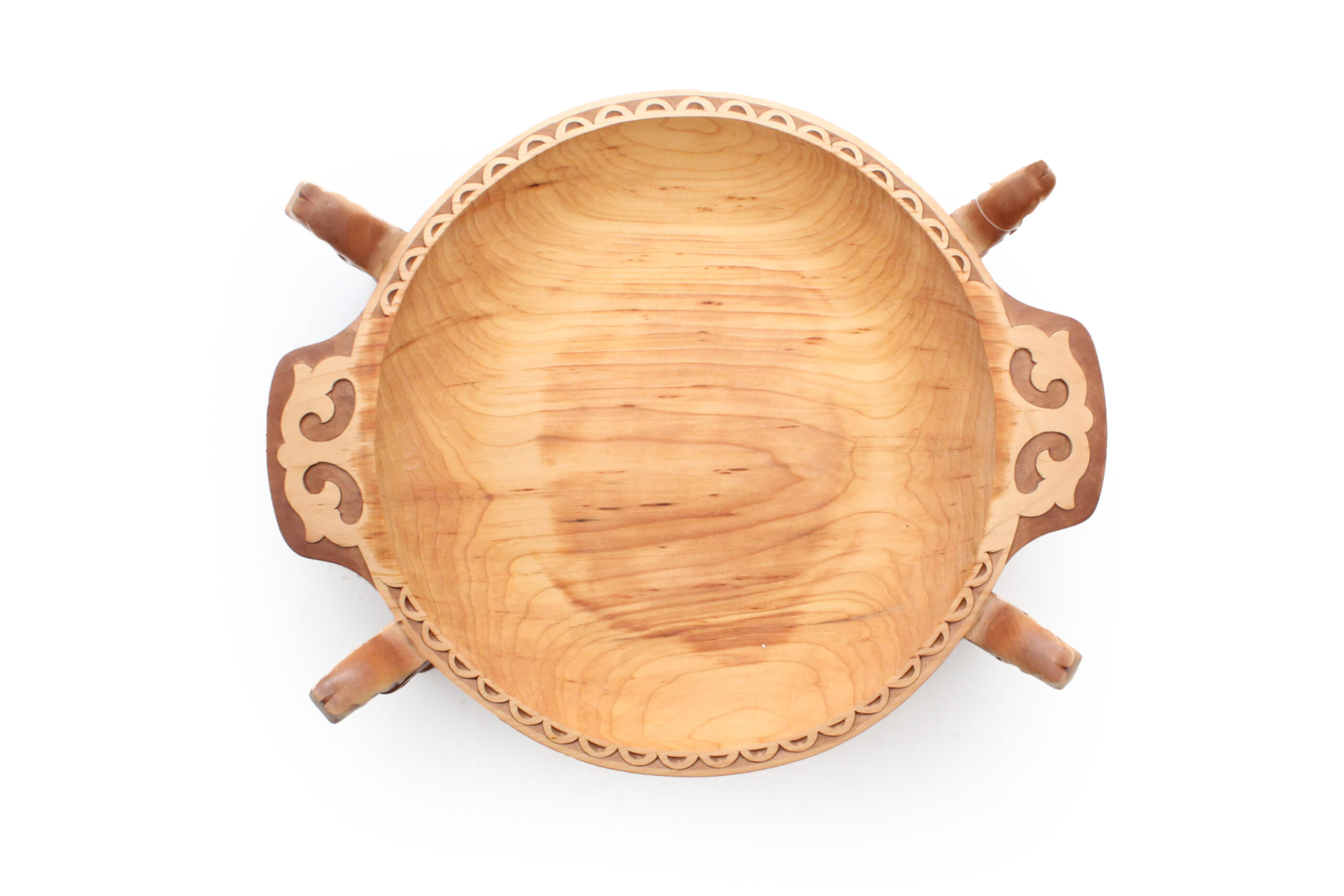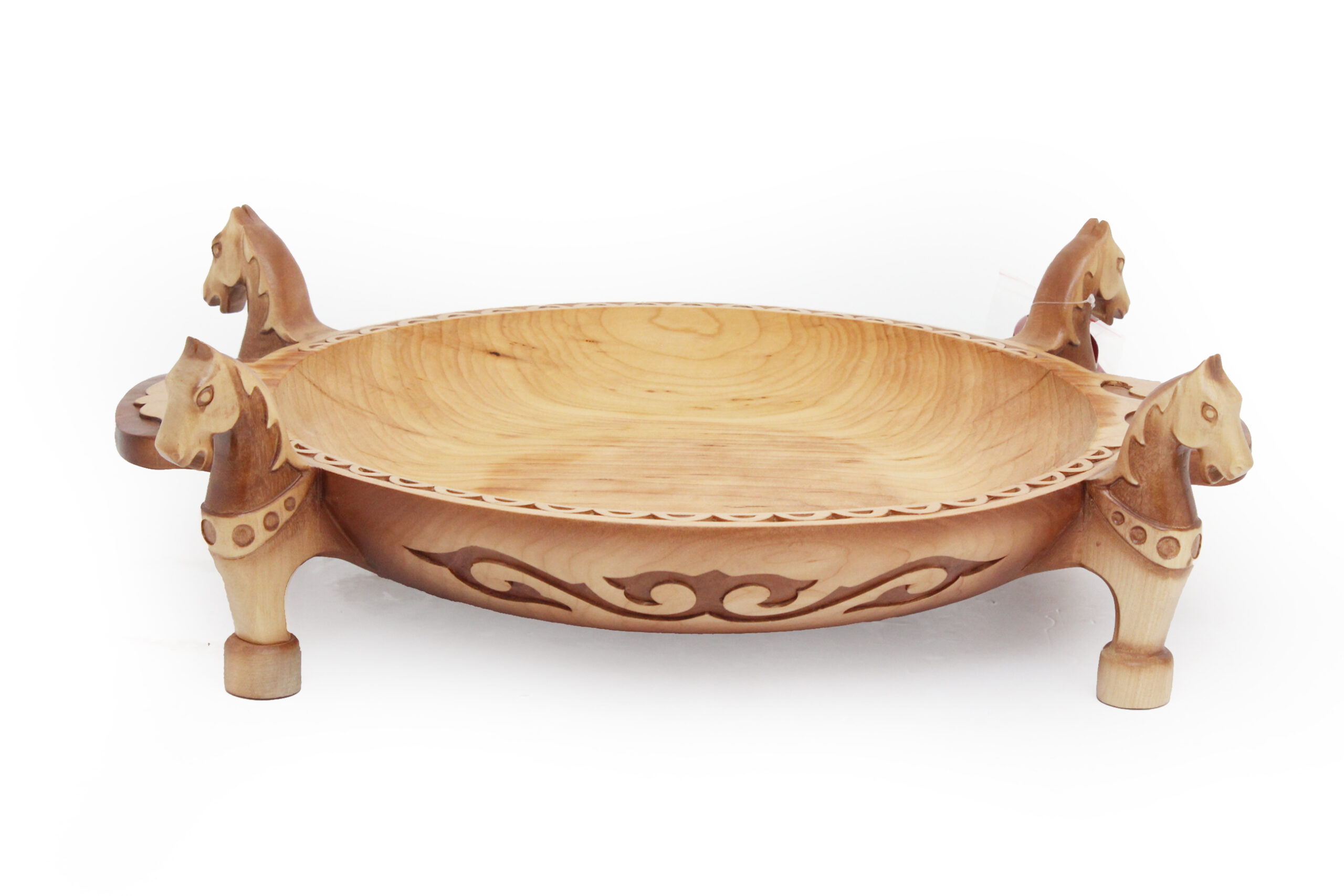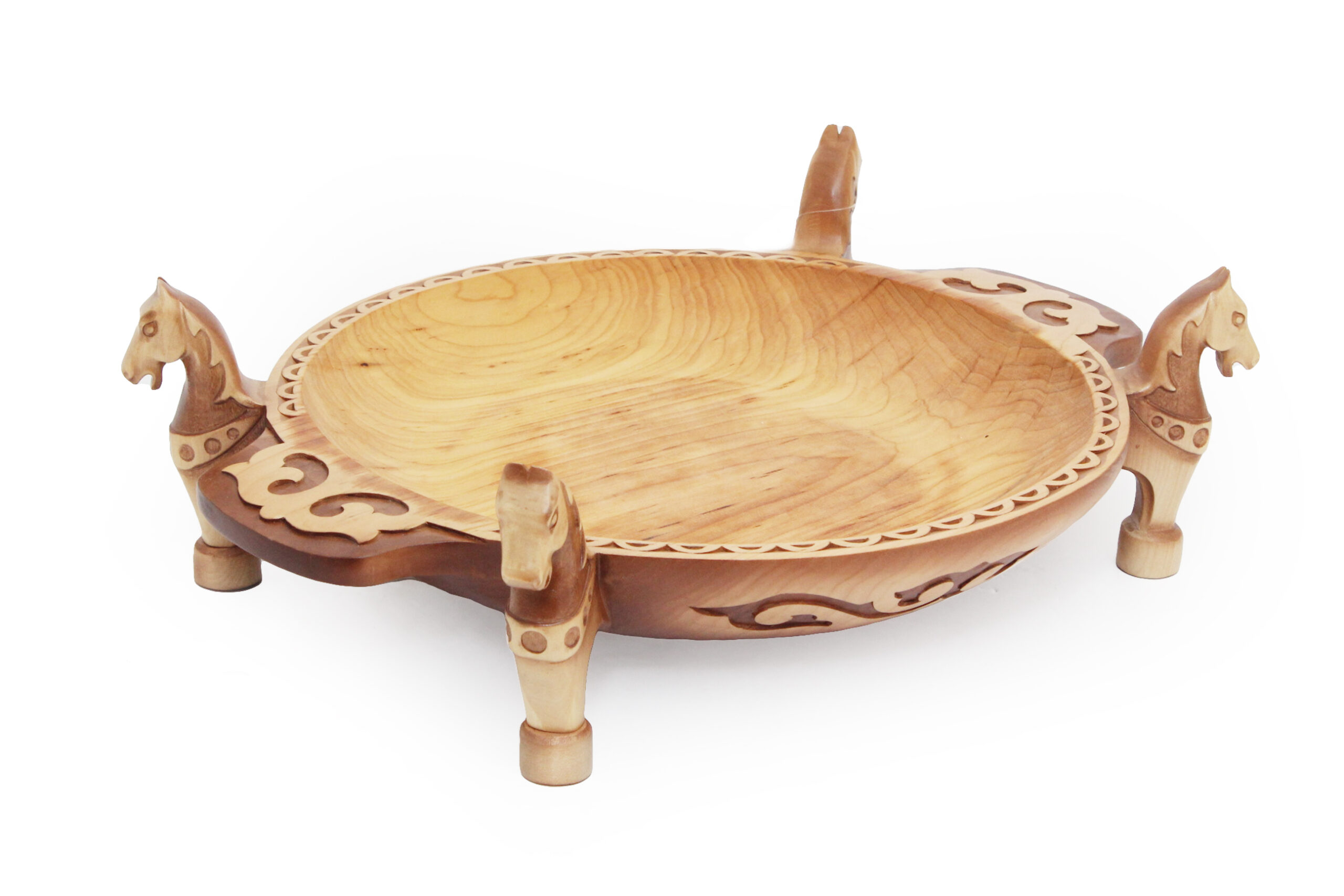 | Покрытие изделия | Блюдо с внешней стороны тонировано и покрыто четырёхслойным защитным лаком, подчёркивающим орнамент и резные элементы изделия. Внутренняя часть обработана растительным маслом. |