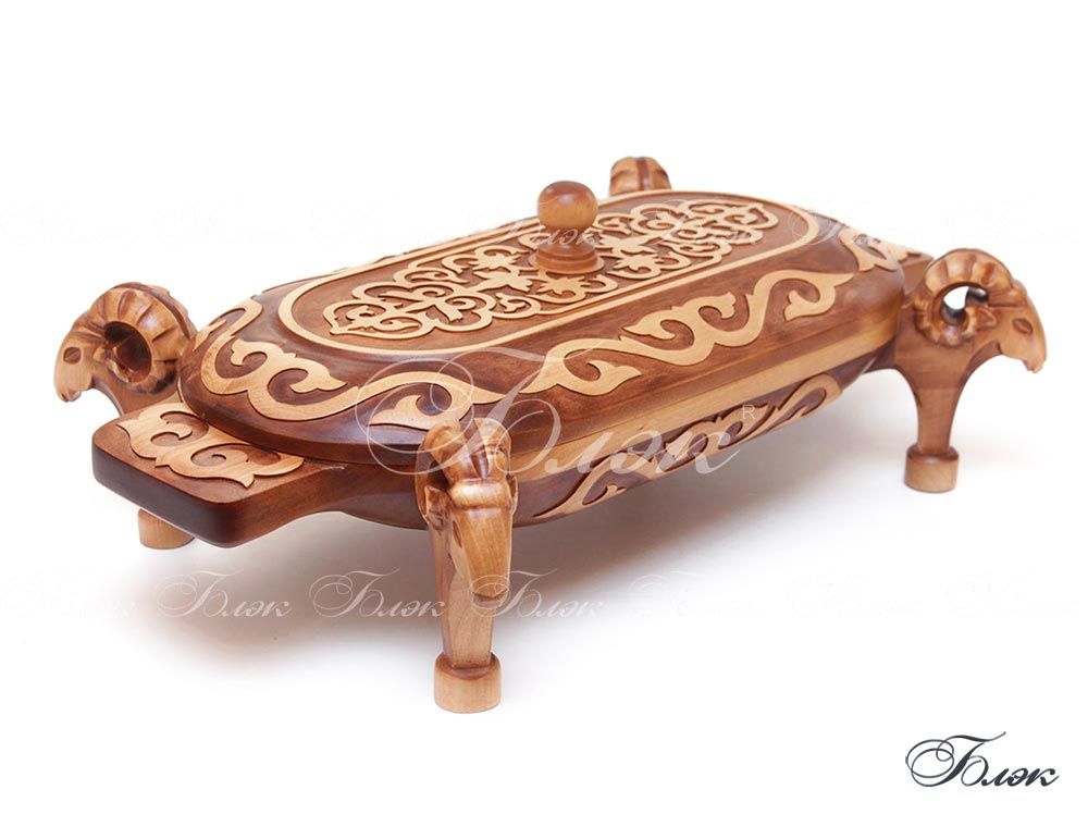 Астау стоит на 4 -х ножках в виде стилизованных животных архаров, также вырезанных вручную. Астау изготавливается вручную, нижняя и верхние части выполнены из цельной доски. |