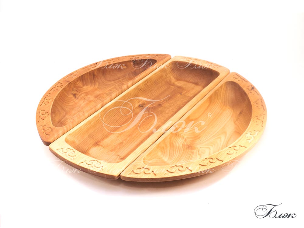 | Форма, размер и материал | Блюдо круглой формы, состоящее из трех частей. Общий диаметр 65, 75 см. Средняя глубина 5,5 см. Используемый материал-берёза. |
