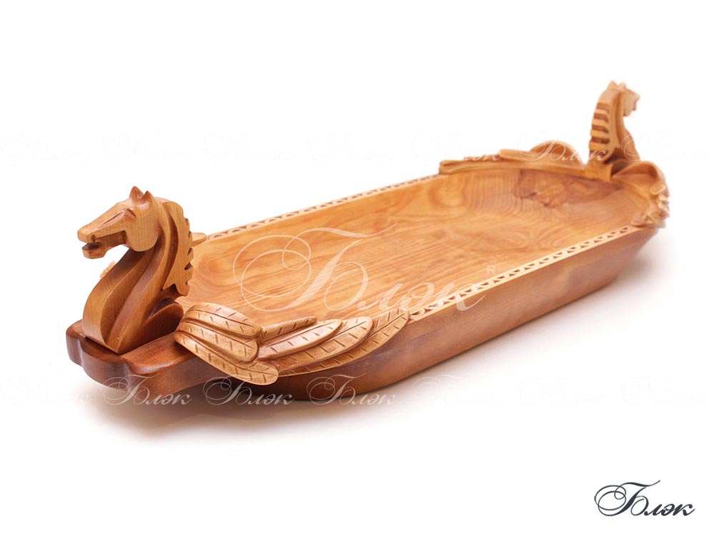 | Внешние характеристики. | Астау с обеих сторон обрамляют большие головы стилизованных крылатых тулпаров, которые придают изделию солидность и неповторимый колорит. Головы надёжно крепятся к основанию астау и выполняют функцию ручек. На бортах, вдоль всего блюда, имеется мелкая резьба в виде полукруга. |