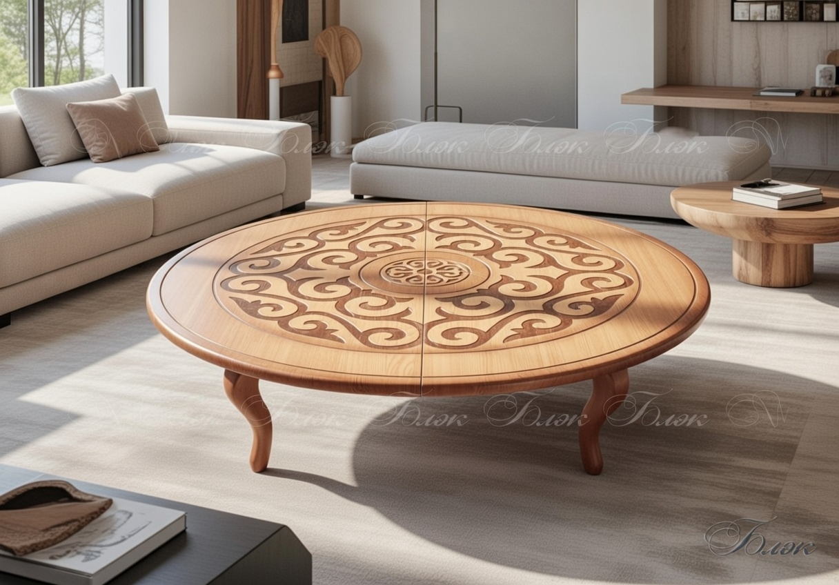 | Внешние характеристики, описание. | Этот стол отличает крупный казахский орнамент. Красиво переплетается по всей поверхности столешницы. Вырезается вручную, что придает ему богатый нарядный вид.