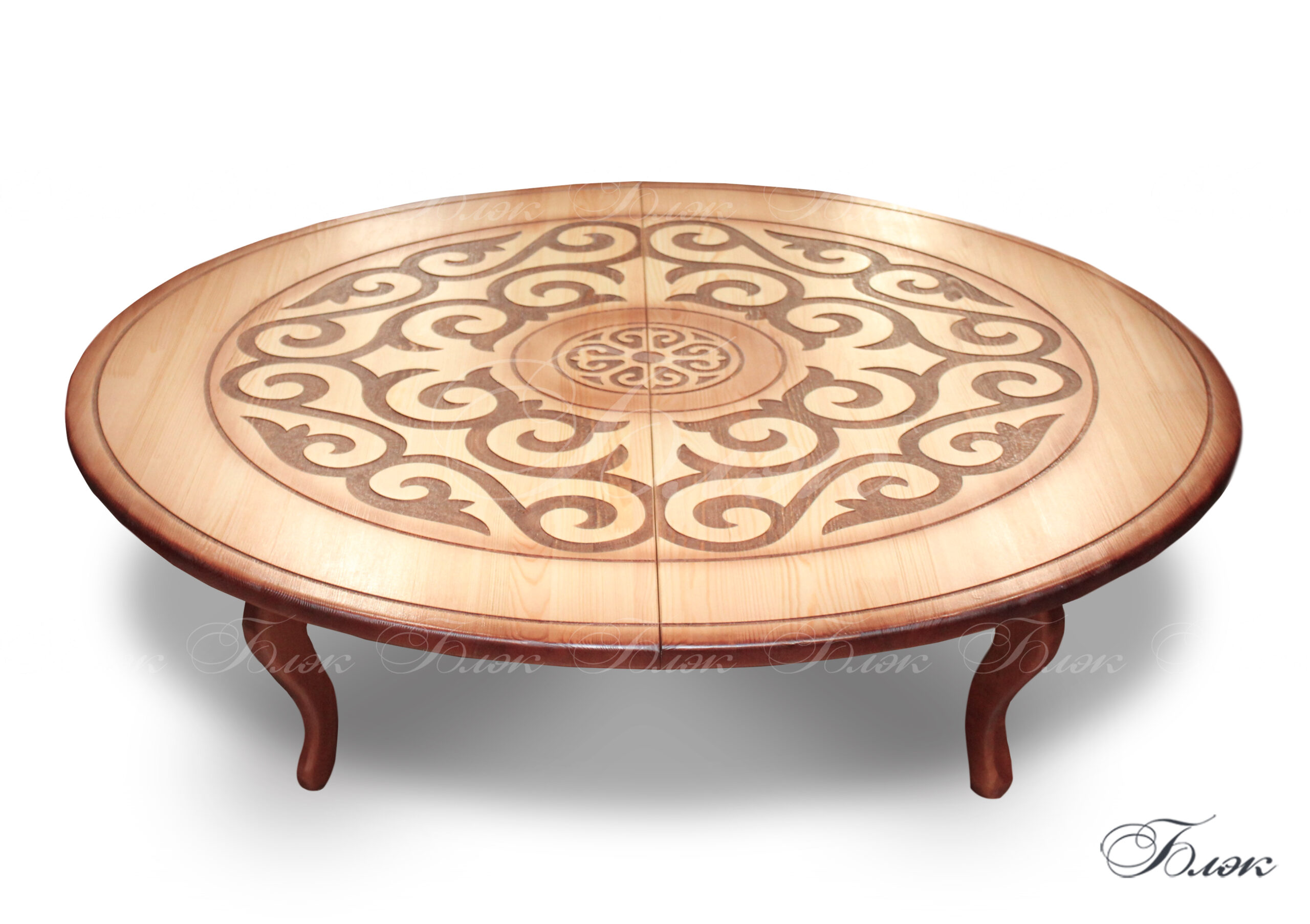 За основу изготовления берётся старинная казахская техника, с применением современных технологий, отработанных на фабрике «Блэк» и специальных креплений. В зависимости от дизайна, на крышке стола наносится разнообразный орнамент. Он подчёркивается специальной техникой тонировки, что придаёт национальный колорит изделию. Столешница данного вид полностью покрыта орнаментальным рисунком, это делает его особенно дизайнерским. |