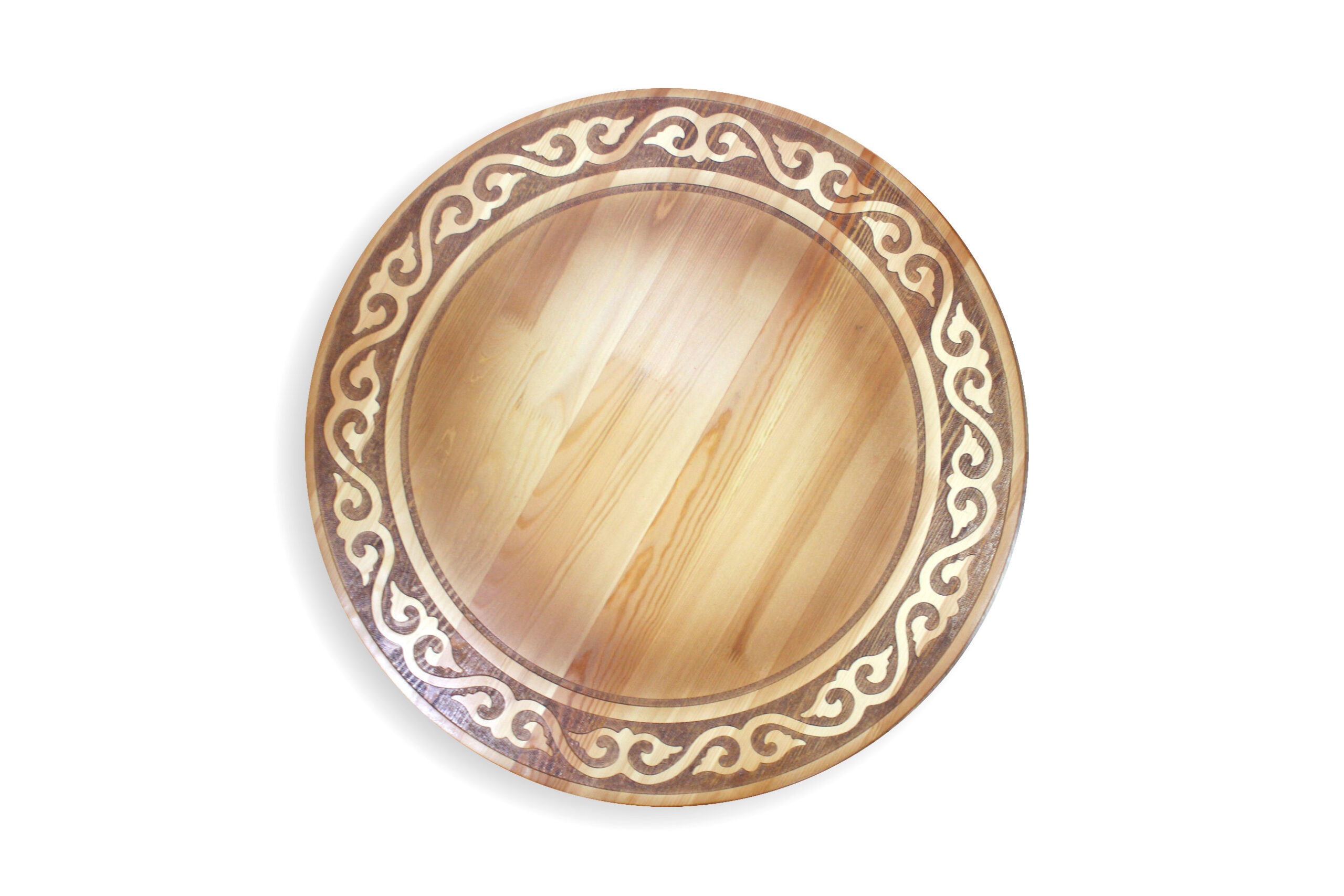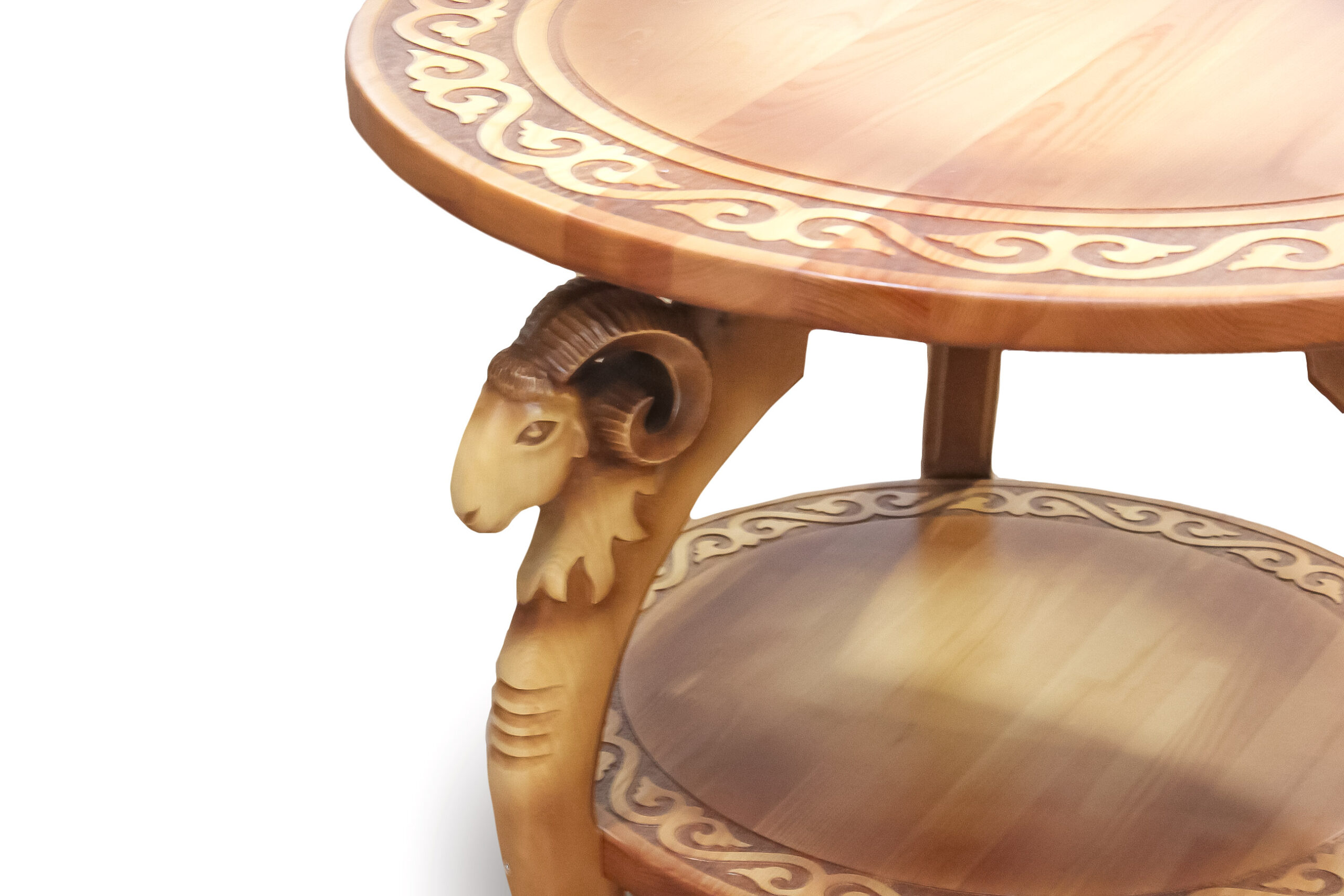 | Внешние характеристики, описание. | Стол выполнен в национальном стиле с богатым резным декором. Опоры украшены резьбой в виде трёх стилизованных голов архаров, что придаёт изделию выразительный характер и символику силы и благородства.
