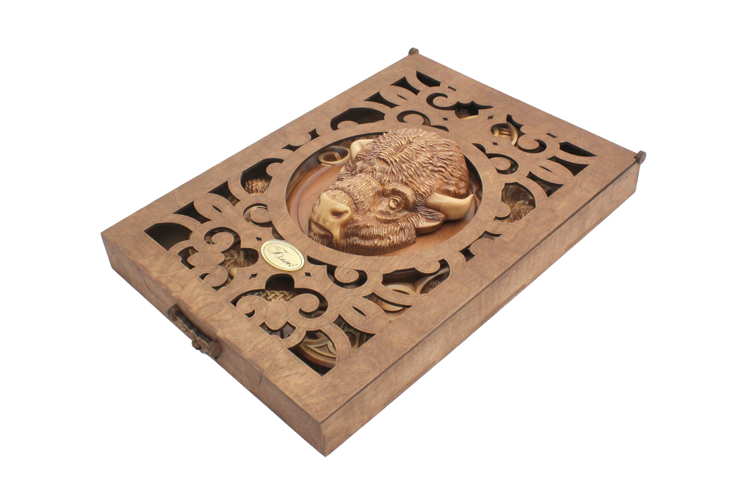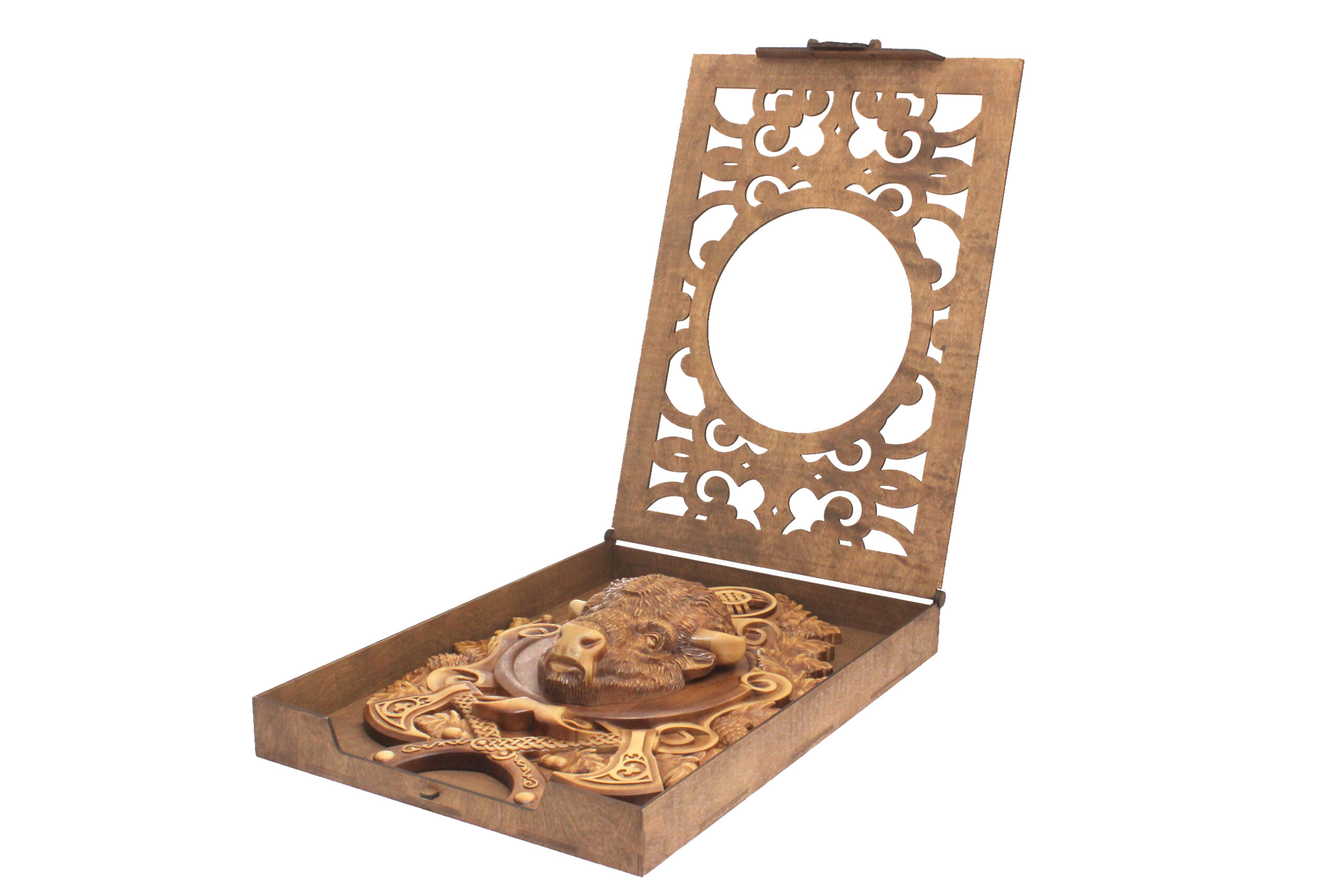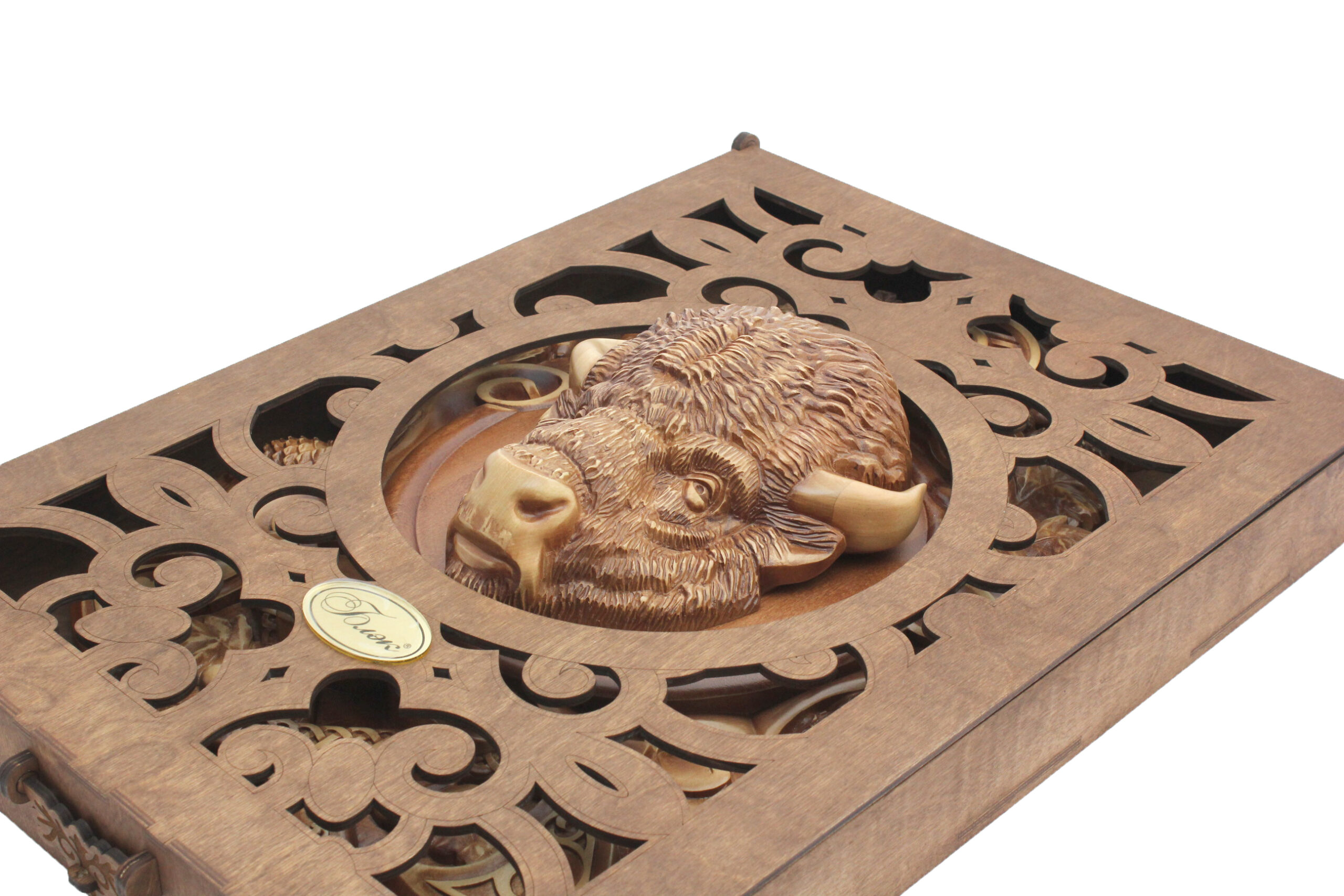Панно «Бизон» будет интересно коллекционерам, ценителям искусства ручной резьбы, любителям этнических мотивов и тем, кто хочет подчеркнуть индивидуальность своего дома, кабинета или загородного интерьера. Для особого оформления предусмотрена подарочная коробка из берёзовой фанеры со специальным вырезом под голову бизона. Она подчёркивает статусность изделия и делает его презентацию ещё более эффектной (приобретается отдельно). Размер коробки: 70*50*8 см. Каждое панно уникально и несёт в себе частицу тепла рук мастера — это не просто украшение, а ценность, которую хочется сохранить и передавать дальше. |