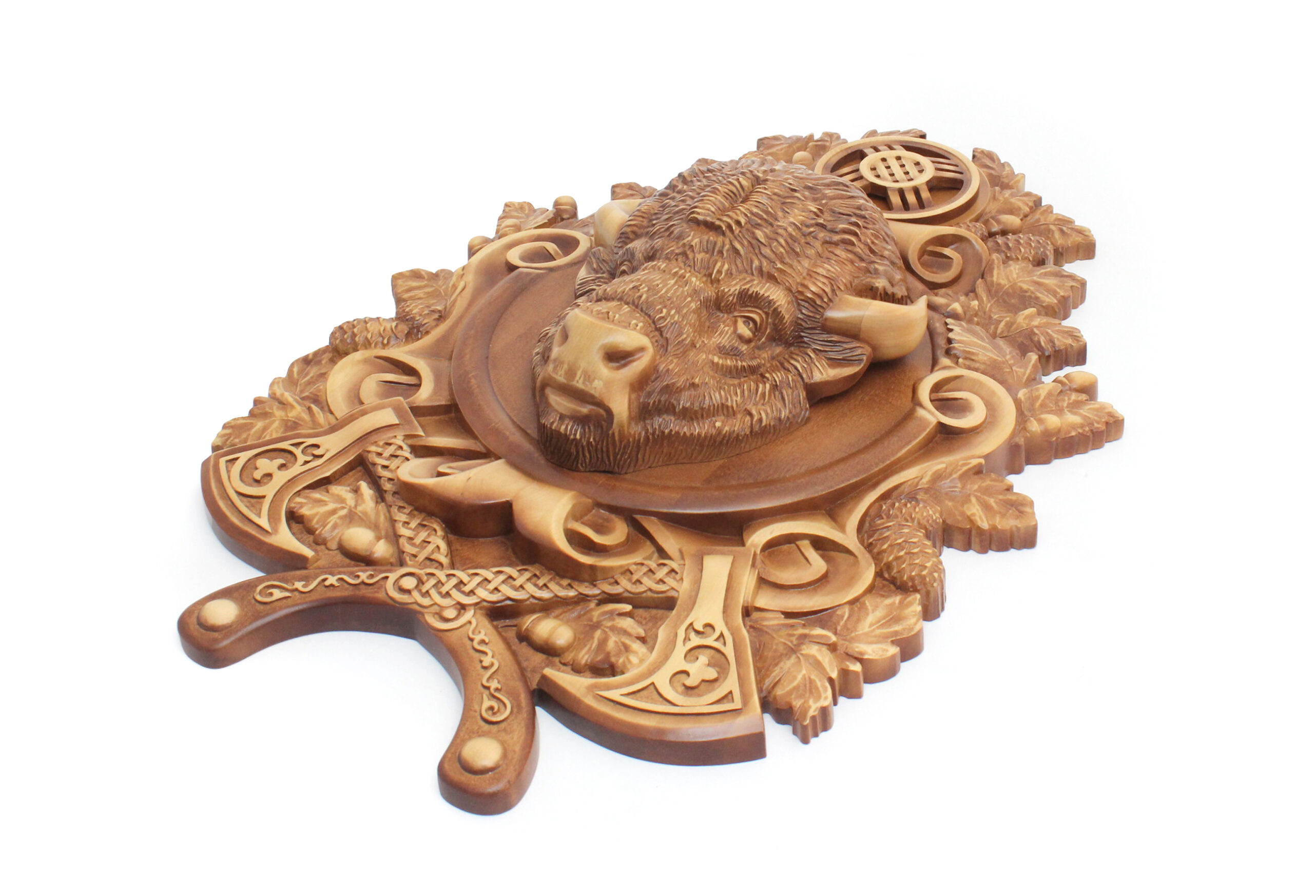 | Внешние характеристики, описание. | Массивное и в то же время утончённое панно «Бизон» – это произведение искусства, созданное мастерами вручную из натуральной берёзы. Его размеры (длина 70 см, ширина 50 см) позволяют гармонично вписать изделие в интерьер, а скульптурное изображение головы бизона возвышается на 9 см, придавая работе выразительный объём и реалистичность.