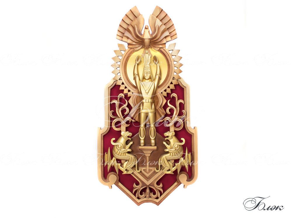 Панно выполнено из нежной, благородной берёзы, каждая мелкая деталь вырезана вручную — от величественного лица Золотого Воина до изящных перьев Самрука. Фон панели обтянут насыщенно‑красным бархатом, создающим глубину и подчёркивающим яркое сияние золотых фигур.