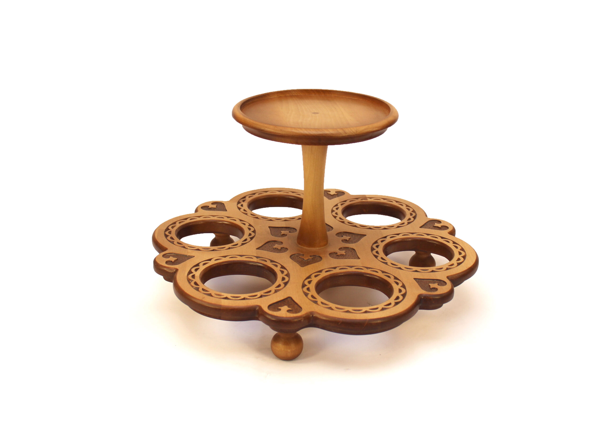 Внешние характеристики, описание. Резная двухуровневая подставка для тегеш и кесе стоит на круглых ножках-шариках. На нижнем ярусе вырезаны шесть отверстии специально под размер кесе. Каждое отверстие обрамлено по краям мелкой резьбой в виде полукруга. Подставка на верхнем уровне предназначена для тегеш. Экономит место на вашем столе.