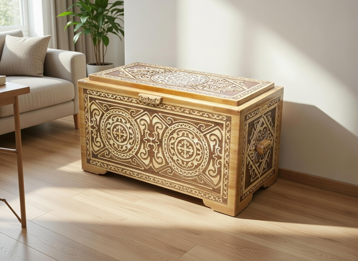 | Форма, размер и материал | Традиционный казахский сундук различных размеров и дизайна, имеет классическую прямоугольную форму. Крышка открывается и надёжно держится в открытом виде благодаря особым креплениям. Для переноса, по бокам крепятся ручки, или имеются отверстия. Имеются устойчивые ножки. В зависимости от назначения, сундук имеет несколько размеров: