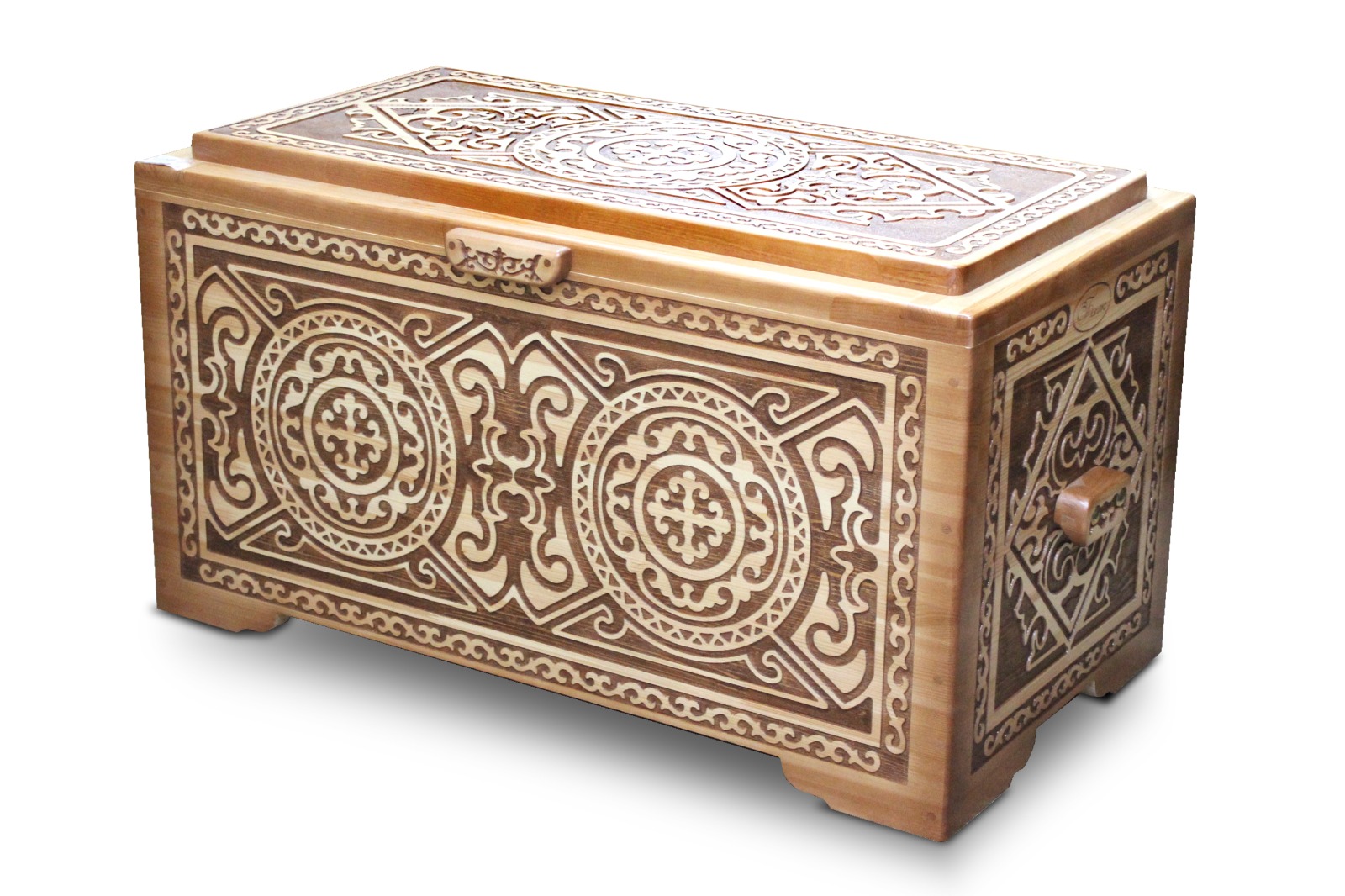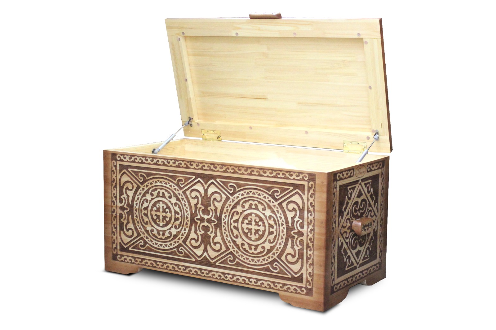 | Творческий замысел | Сундук — это не только часть культуры казахского народа, но и необходимый элемент мебели, в котором наши предки хранили не только постельное белье, и домашние вещи, но и продукты впрок. В маленьких сундучках хранили сладости и чай, или драгоценности. Украшенный ручной резьбой, сундук всегда был неотъемлемой частью девичьего приданого. Когда устраивали проводы невесты, то ее одежду, украшения и постельные принадлежности складывали в сундук, и в дом будущего супруга она отправлялась со своим приданым. |
