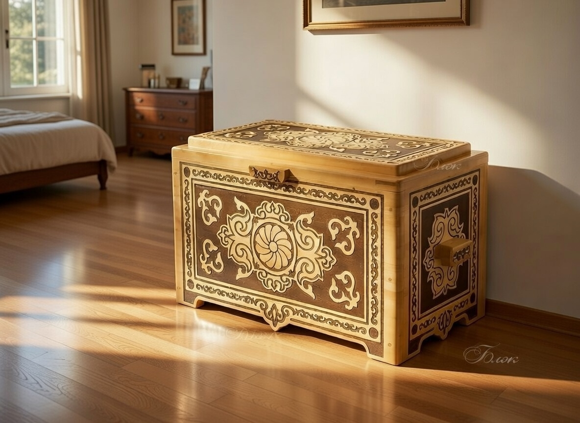 | Внешние характеристики, описание. | Сундук украшается разнообразным орнаментом, имеющим различную сложность и дизайн, который выполняется в различных мотивах. Геометрический -ромбы, прямоугольники или цветочный рисунок могут покрывать полностью поверхности сундука или частично. Покраска специальной техникой тонировки, подчёркивает резьбу и сложность работы. |