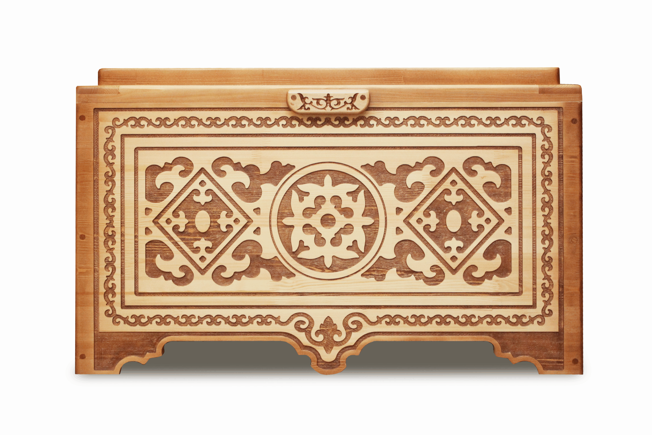 | Внешние характеристики, описание. | Сундук украшается разнообразным орнаментом, имеющим различную сложность и дизайн, который выполняется в различных мотивах. Геометрический -ромбы, прямоугольники или цветочный рисунок могут покрывать полностью поверхности сундука или частично. Покраска специальной техникой тонировки, подчёркивает резьбу и сложность работы. |