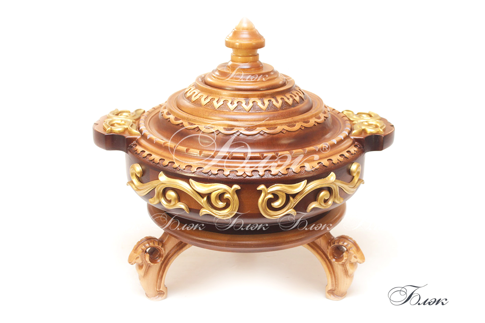 | Внешние характеристики, описание. | Тегеш « Алтын ОЮ» имеет элитный и дорогой дизайн. Корпус выполнен из составных частей дерева, по особой технологии. Декорированная орнаментом крышка имеет конусообразный вид и украшает тегеш, визуально увеличивая его в высоту. Все изделие украшено богатой резьбой, объёмным позолоченным орнаментном на ручках и корпусе. Тегеш изготовлен с применением специальной наборной техники склейки, из материала достаточной толщины, которая позволяет использовать его без специальной металлической чаши.