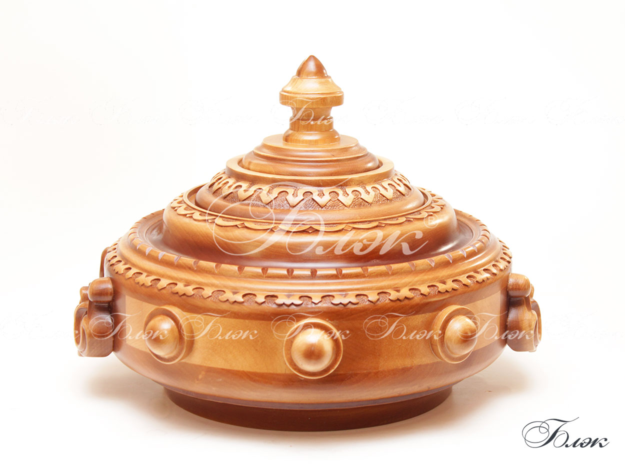 | Форма, размер и материал | Тегеш имеет круглую форму, накрывается резной крышкой. Изготавливается преимущественно из берёзы, по особой, отработанной на предприятии и запатентованной технологии. Диаметр тегеша 30 см, вместимость 4 л. |