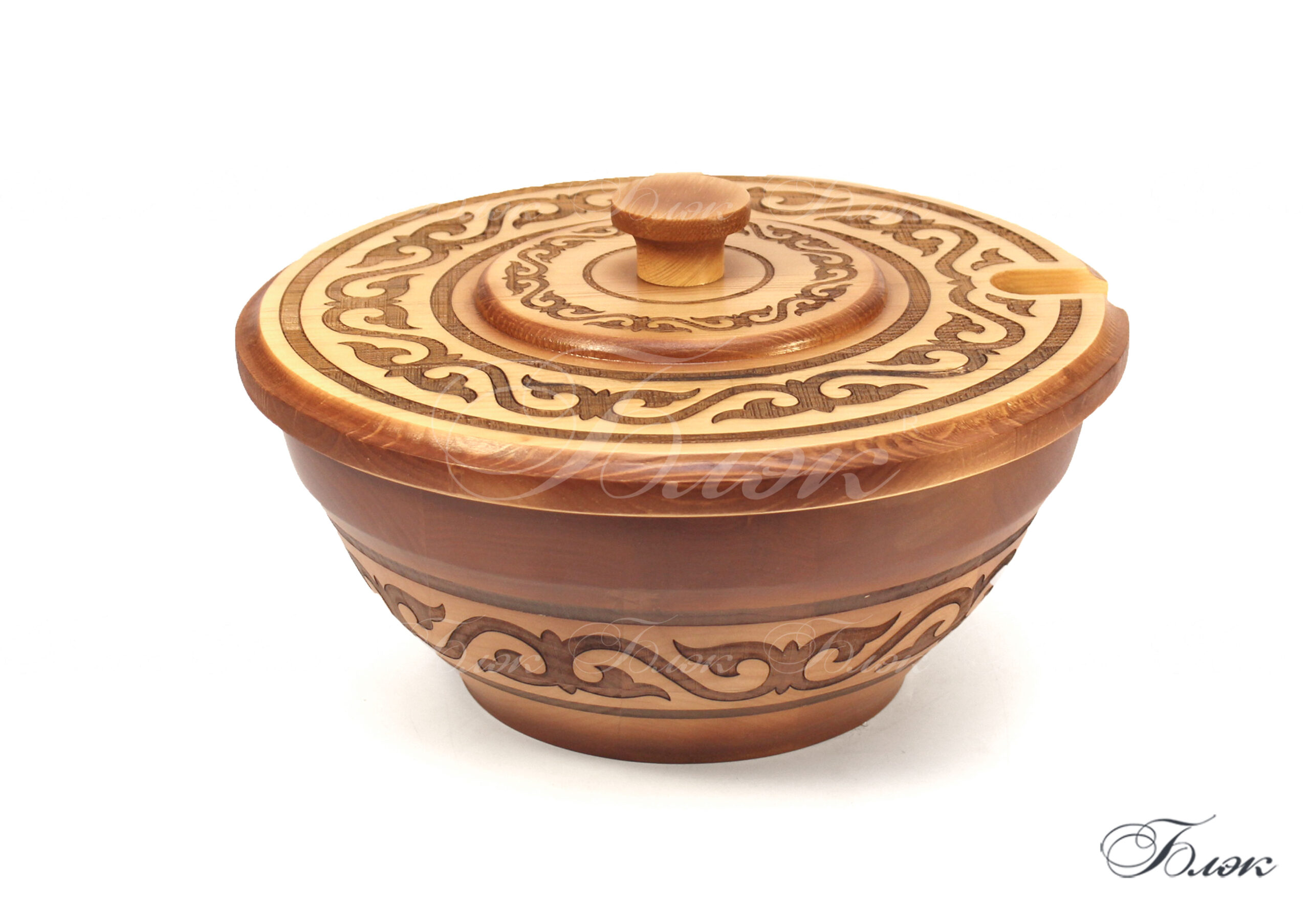 | Внешние характеристики, описание. | На внешней стороне тегеш украшен национальным орнаментом. Орнамент украшает и подчёркивает национальный колорит, выполнен в авторской технике гравировки. Внутрь вставлена металлическая съёмная чаша из нержавеющей стали высокого качества, сделанная по заказу фабрики «Блэк». Имеется сертификат качества. Данная чаша предотвращает соприкосновение жидкости и дерева и позволяет наливать напитки, не боясь растрескивания дерева. Тегеш накрывается крышкой, так же украшенной красивым орнаментом. У данного вида тегеш нет ручек для переноса. |