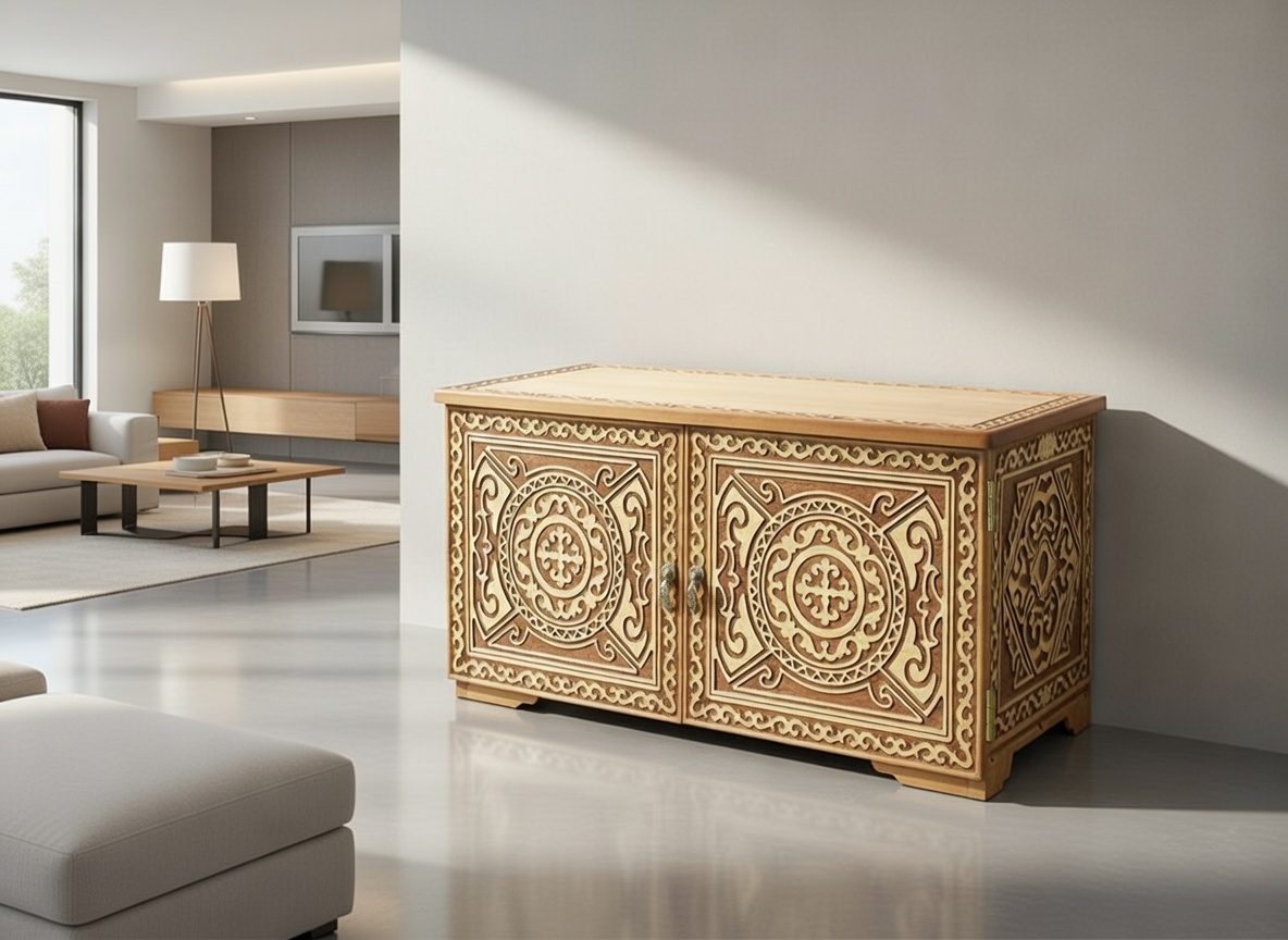 | Внешние характеристики, описание. | Тумба выполнена в национальном стиле. Дверцы и боковые стенки полностью украшены богатой резьбой. Самая совершенная фигура в геометрической символике – круг, сплетается с другими орнаментальными мотивами на передней части мебели. Декоративные ручки дополняют и украшают дверцы. Верхняя крышка тумбы гладкая, без рисунка. Внутренние полки широкие и вместительные. На заказ можно врезать замок и также изменить размер при необходимости. |