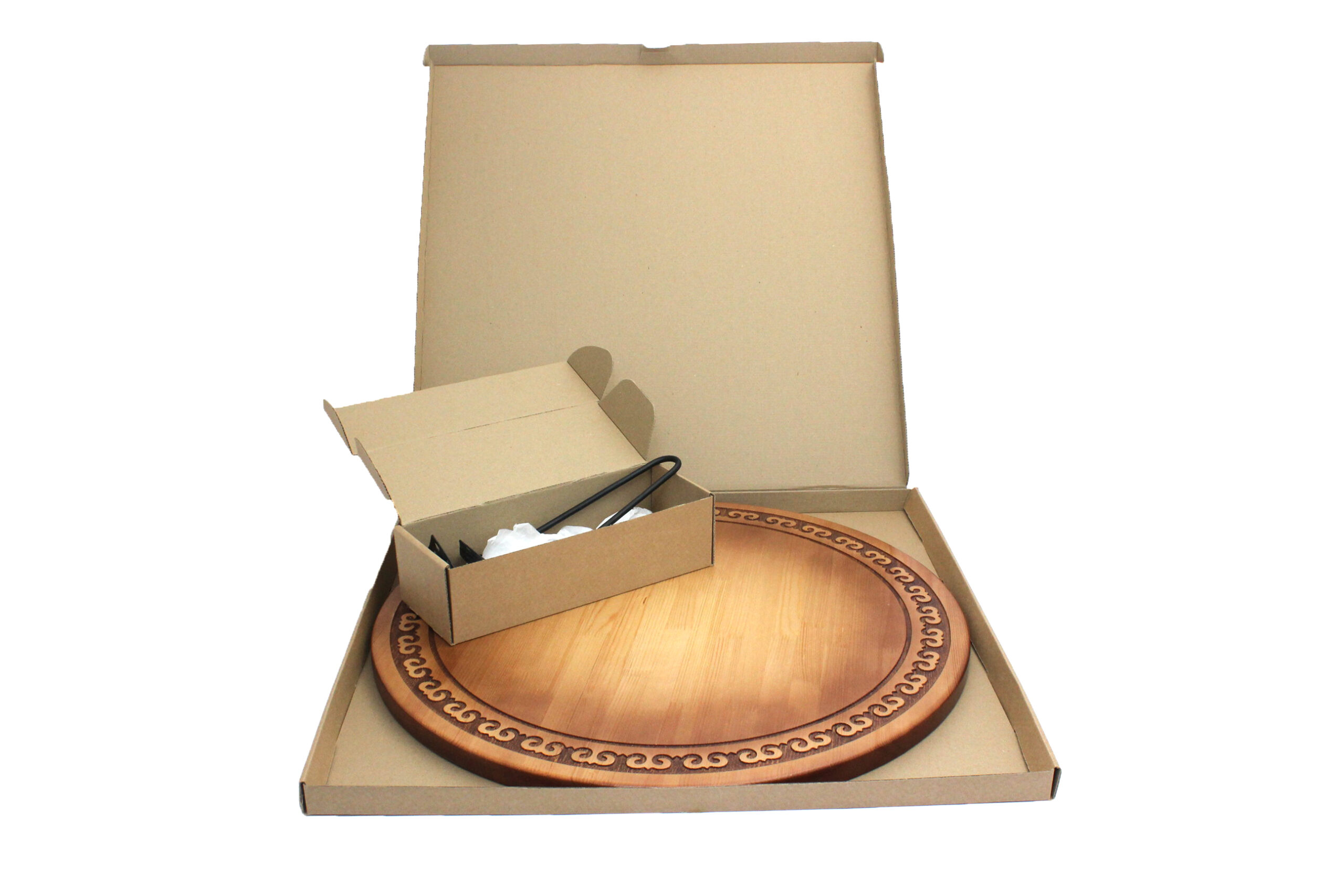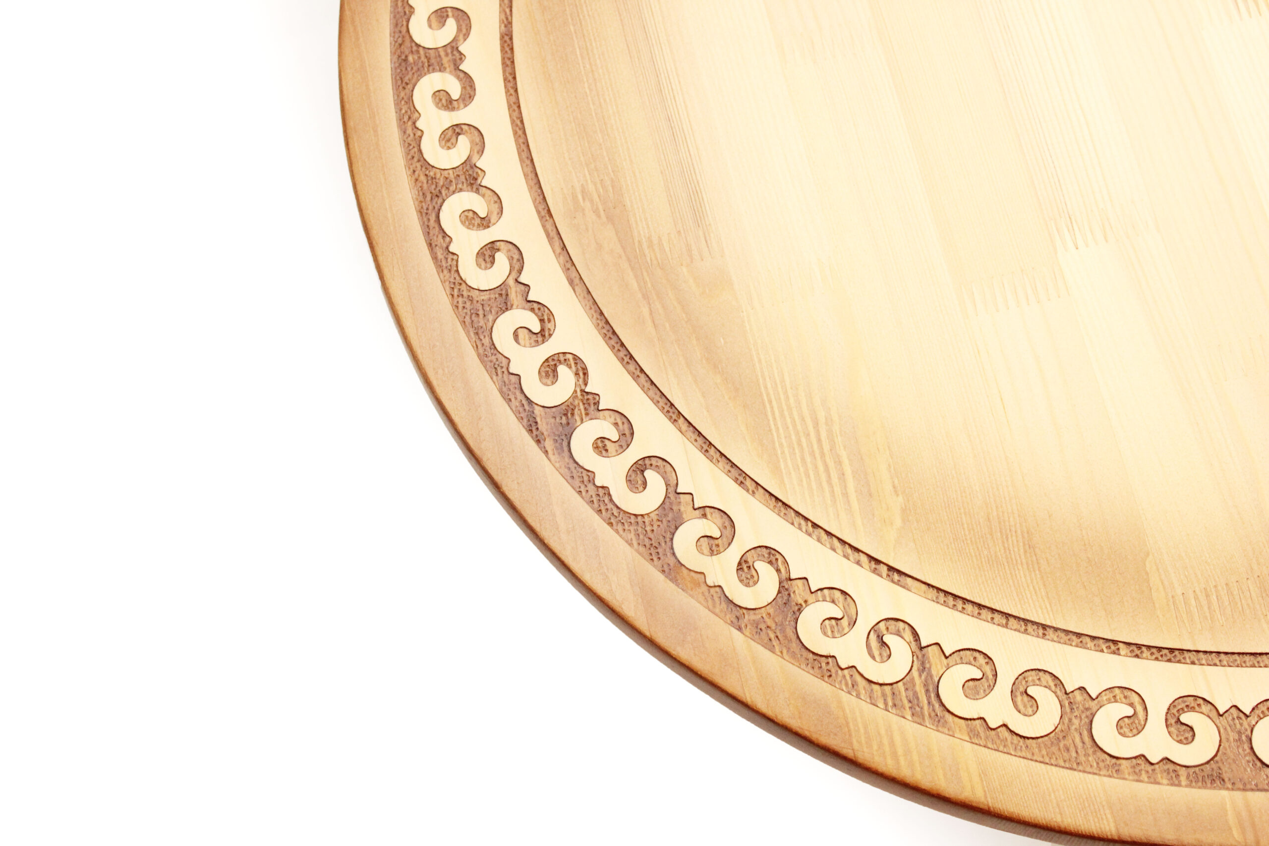 | Внешние характеристики, описание. | По краю столешницы выполнена ручная резьба в виде традиционного казахского орнамента. Техника тонировки подчёркивает глубину резьбы и придаёт изделию национальный колорит. Ножки металлические, прочные и устойчивые, окрашены в чёрный цвет. Их минималистичный дизайн создаёт контраст с древесиной и придаёт столу современный вид. |
